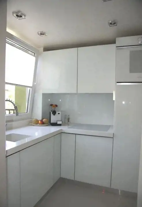 Kuchnia zaprojektowana na wymiar, blat wykonany z białego konglomeratu, w pełni wyposażona.
