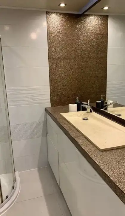 Łazienka posiada szafki na wymiar, zabudowaną pralkę, kabinę prysznicową z niskim brodzikiem z marmuru.