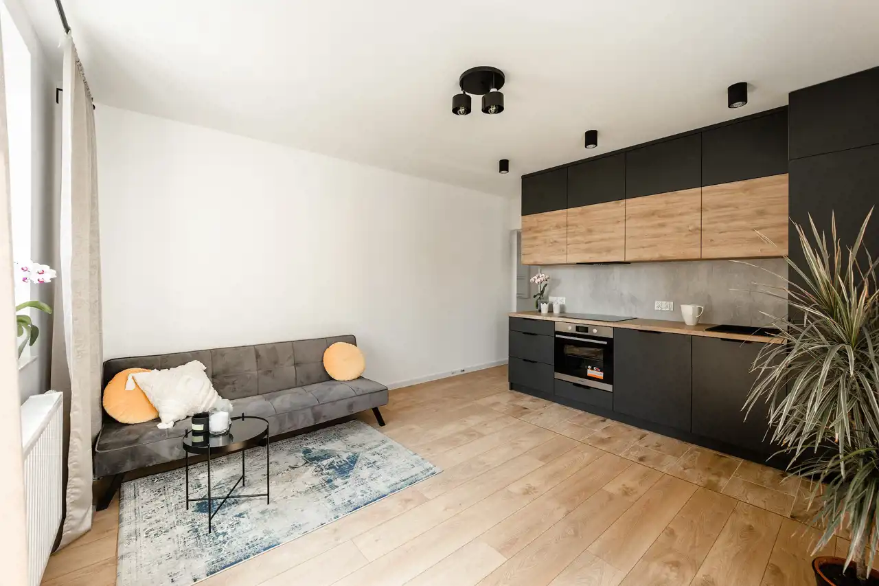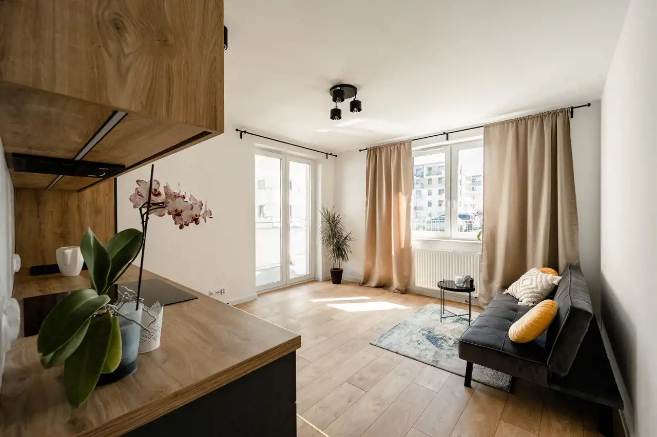 Mieszkanie posiada salon z aneksem kuchennym i wyjściem na duży taras . Aneks kuchenny w pełni wyposażony w sprzęt AGD .