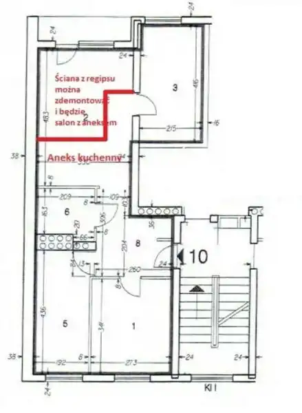 Mieszkanie było gruntownie remontowane pięć lat temu (m.in. nowe okna PCV, pełna nowa instalacja elektryczna, nowe podłogi itp.). Usuwając jedną ściankę działową z regipsu możemy uzyskać duży salon z aneksem kuchennym oraz trzy oddzielne pokoje