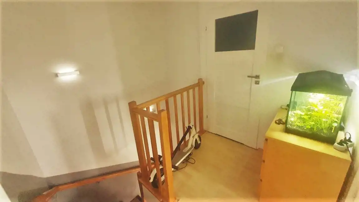 -na pierwszym poziomie pokój z aneksem kuchennym i korytarzem (całość około 20m2), łazienka z kabiną prysznicową (około 3m2), balkon (około 3m2)