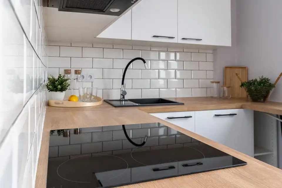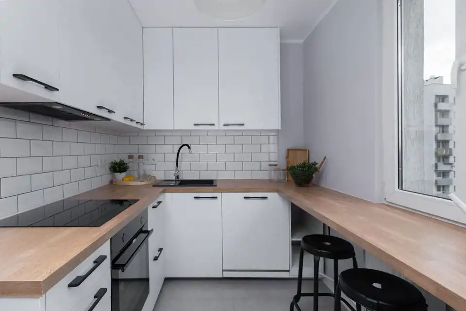 osobnej jasnej kuchni , kuchnia wyposażona w płytę indukcyjną, piekarnik, zmywarką oraz lodówkę