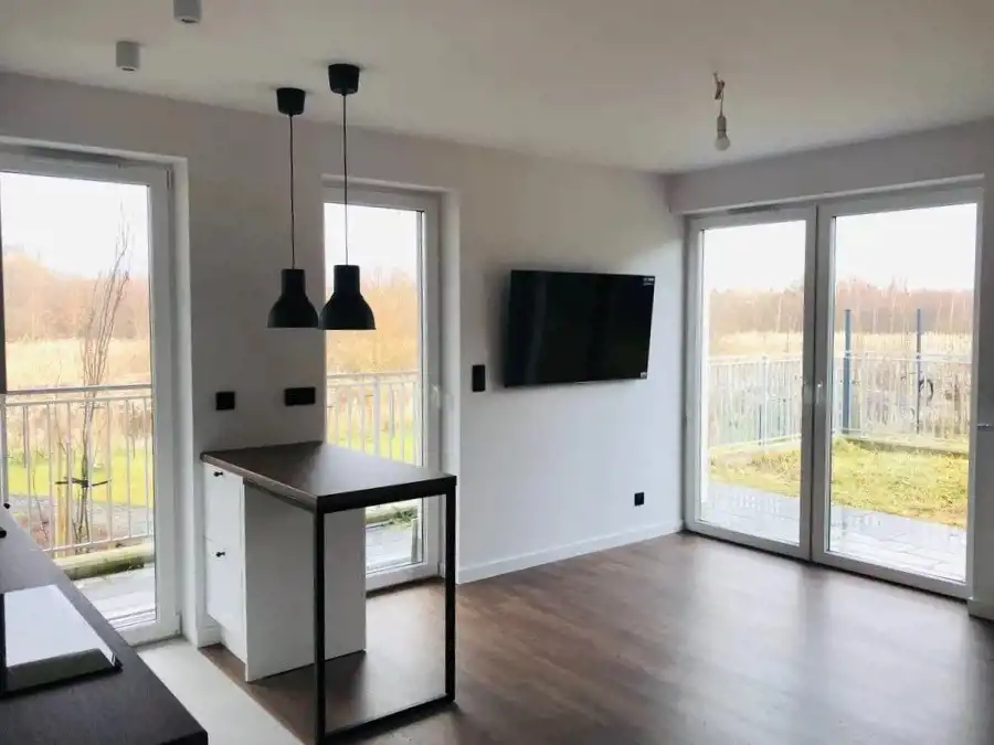 Mieszkanie jest bardzo dobrze doświetlone, z racji dużych okien. W samym tylko salonie są 4 duże okna, z każdego pokoju możemy wyjść do ogrodu. W każdym oknie są zamontowane elektryczne rolety zewnętrzne.