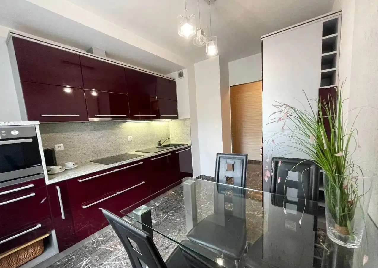 - Kuchnia jest umeblowana na wymiar, posiada granitowe blaty, szafki lakierowane na wysoki połysk, tynk ozdobny w kolorze srebrnym oraz pełne wyposażenie