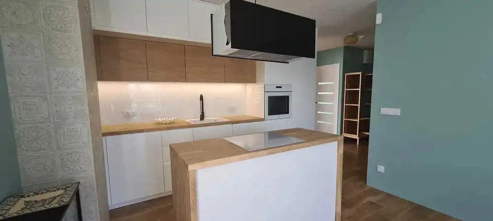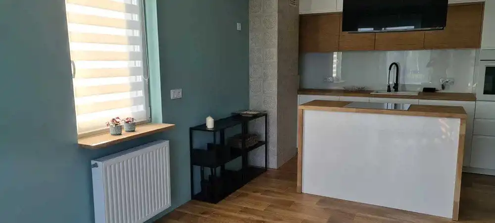 Mieszkanie jest wykończone w najwyższym standardzie, z dbałością o każdy detal. Nie wymaga żadnych nakładów finansowych jest gotowe do wprowadzenia się. Na podłogach panele, w łazience szkliwione płytki, w kuchni blaty z najwyższej jakości drewna dębowego. W kuchni wyspa z płyt ą elektryczną, podwieszany wyciąg kuchenny, w salonie wentylacyjny piec imitujący kaflowy.