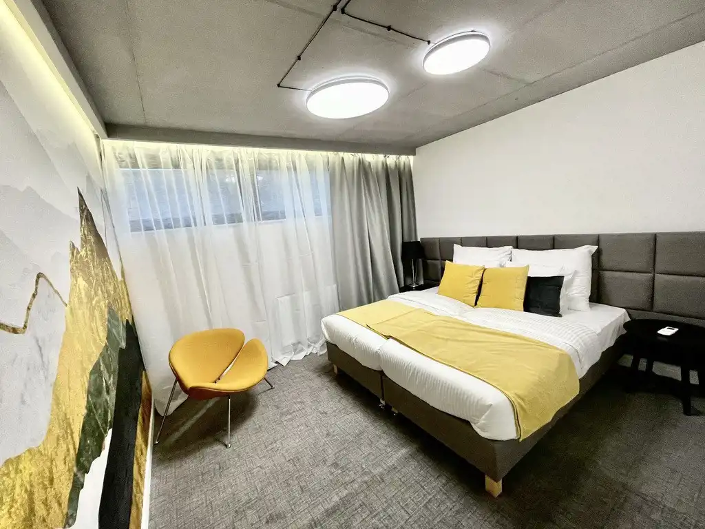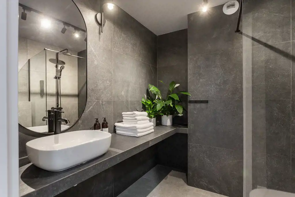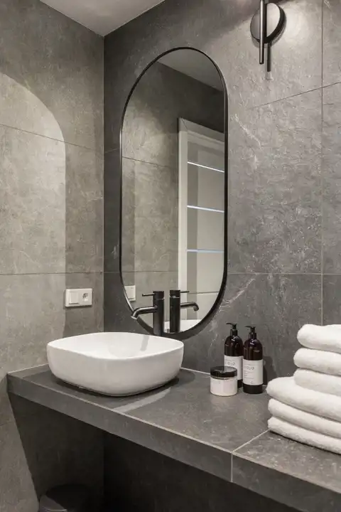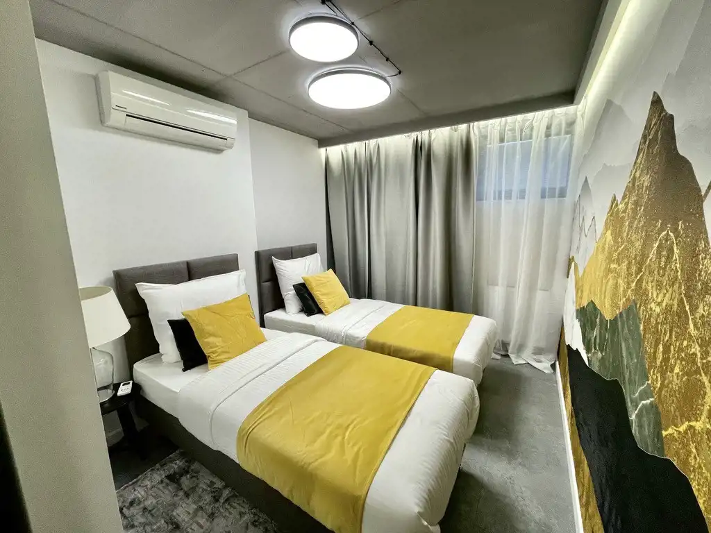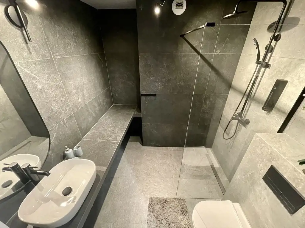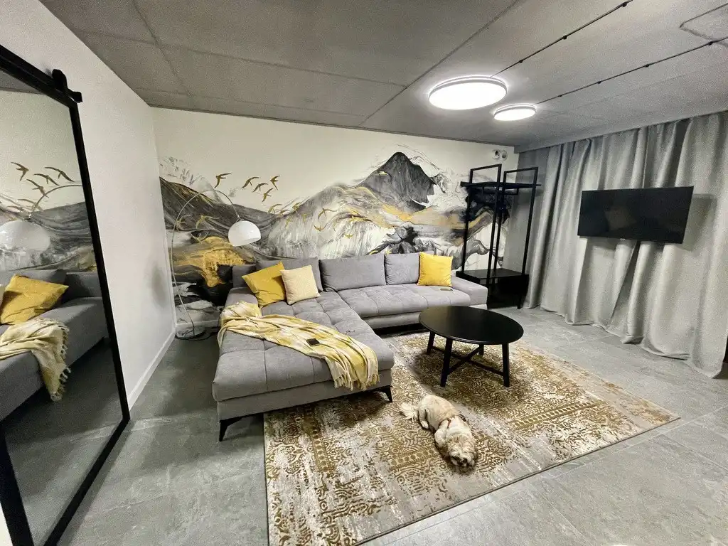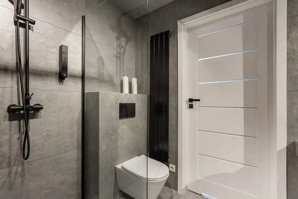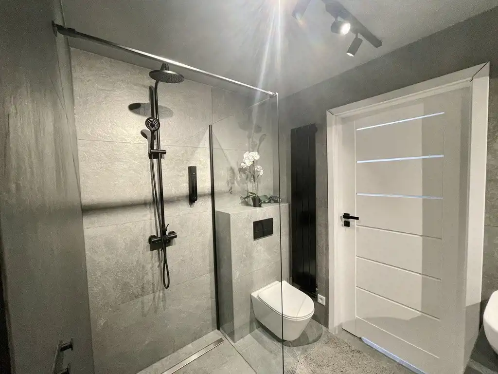 - wykończona podłoga: płytki gres 60 cm x 120 cm + dywany w części sypialnianej i salonie,