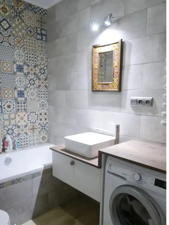 5) barwną łazienkę z wanną i szybą prysznicową i przestrzenią do przechowywania.