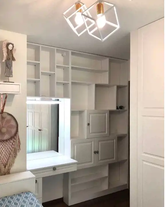 2) stylową sypialnię z pojemną szafą, biblioteczką i toaletką,