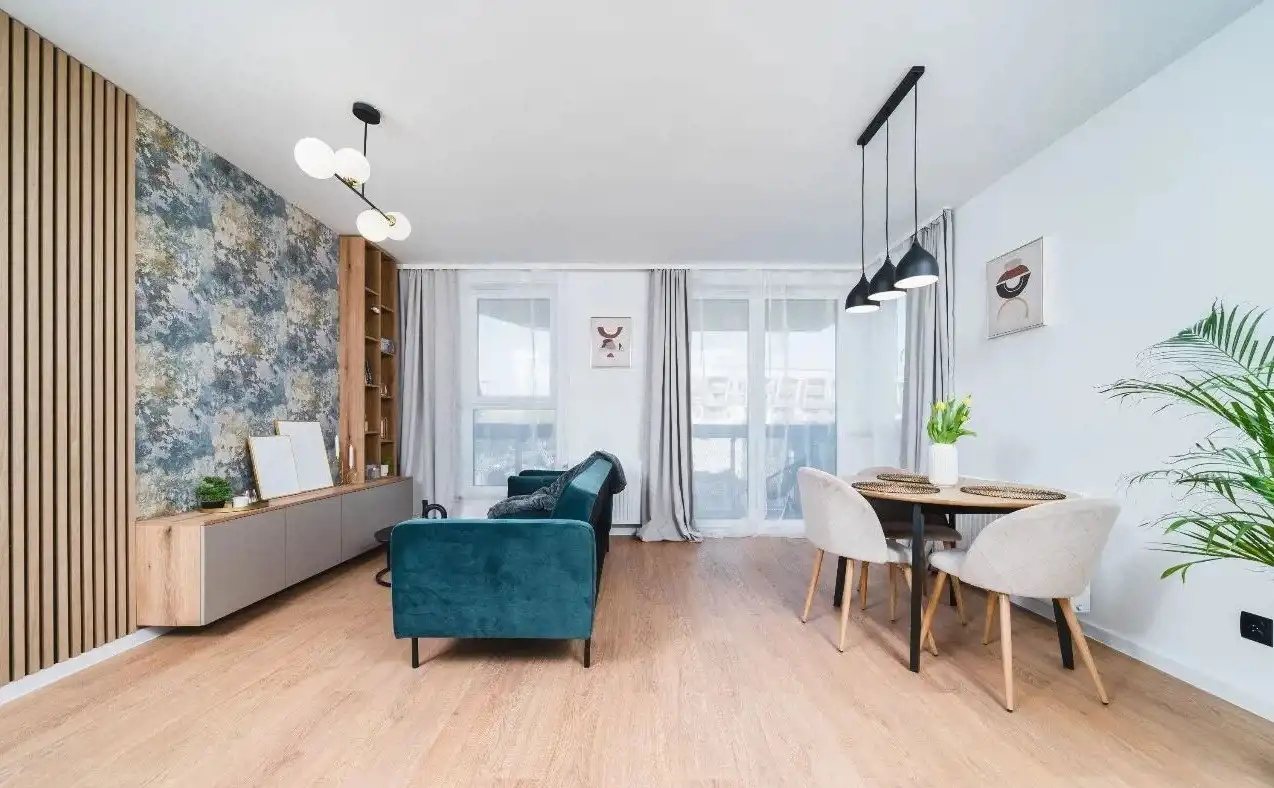 Mieszkanie o łącznej powierzchni 61m2 składa się z przestronnego salonu z aneksem kuchennym i częścią jadalnianą, ustawnych 2-óch sypialni, łazienki , przedpokoju z pojemną szafą wnękową oraz garderoby z pralnią.