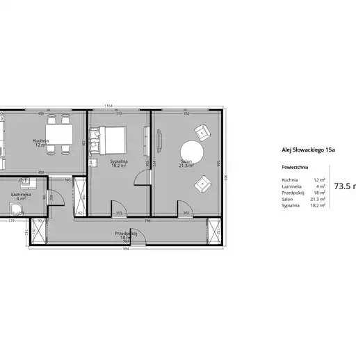 - Charakterystyka mieszkania 73.5 m2, 2 pokoje