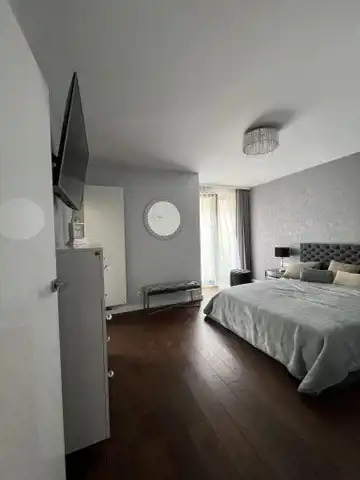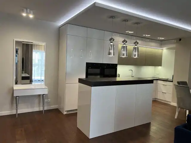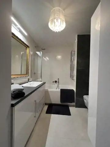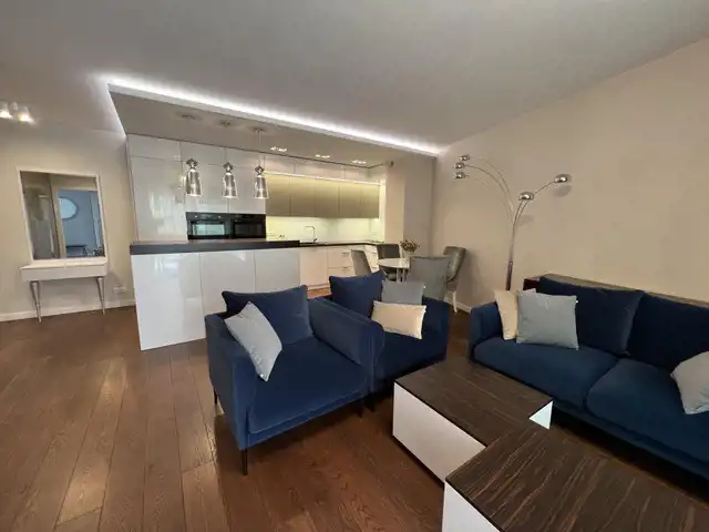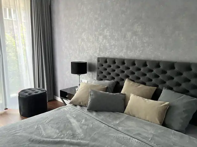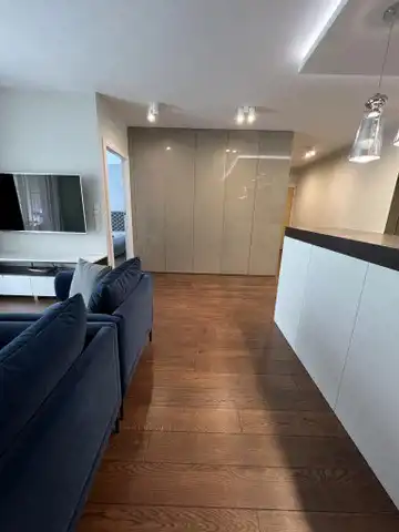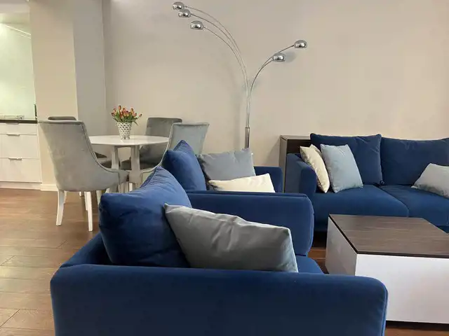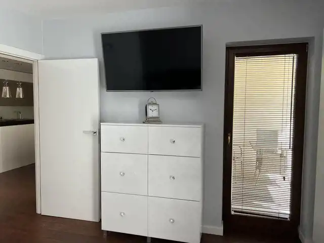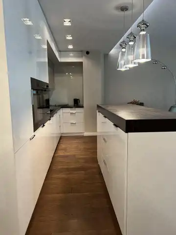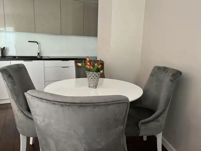 Mieszkanie jest wykończone w bardzo wysokim standardzie, z dbałością o każdy detal. Jest w pełni umeblowane i wyposażone w najwyższej klasy sprzęty. W łazience nowoczesna pralko- suszarka, w kuchni płyta indukcyjna, piekarnik, kuchenka mikrofalowa, zmywarka, chłodziarko-zamrażarka. Na życzenie najemcy doposażenie w ekspres do kawy. W salonie kanapa, stolik, duży telewizor, w sypialni łóżko typu kingsize z włoskim materacem, komoda oraz duży telewizor. Na tarasie stolik kawowy oraz krzesła.