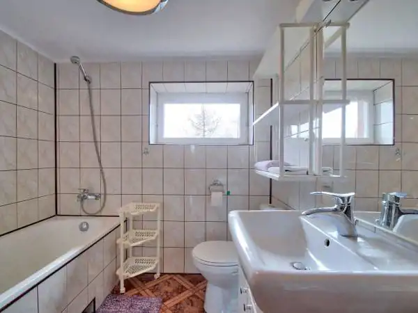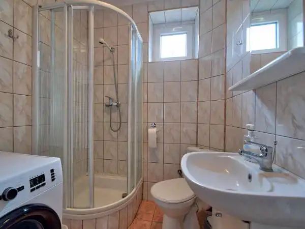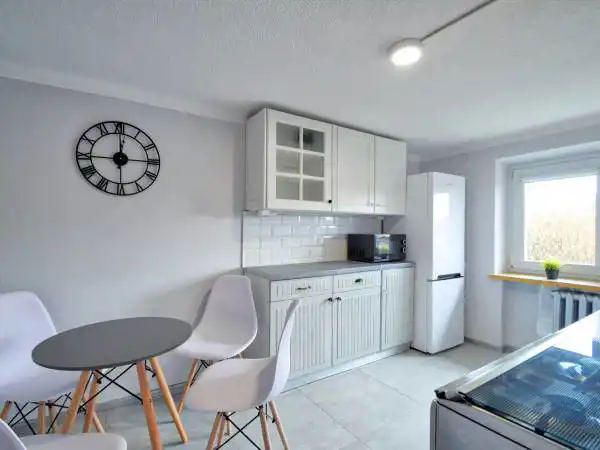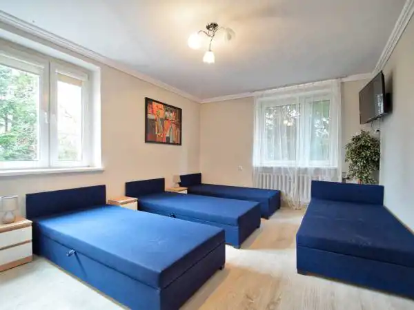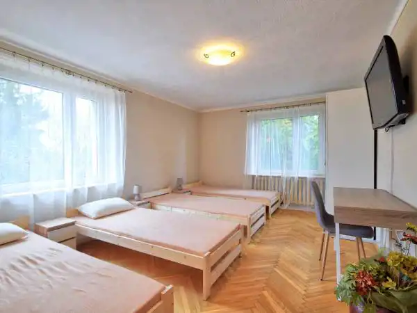PARTER: POKOJE: na podłogach panele, na ścianach gładź gipsowa. Pokoje wyposażone w łóżka, telewizory, szafy, regały, stoły i krzesła. ŁAZIENKA (glazura i terakota) z kabiną prysznicową i WC wyposażona również w umywalkę, lustro, szafkę i pralkę. KUCHNIA: na podłodze terakota, na ścianie: płytki oraz gładź gipsowa. Wyposażenie: szafki kuchenne, mikrofala, kuchenka gazowa, piekarnik, lodówka. PRZEDPOKÓJ: na podłodze płytki, na ścianach tynk malowany farbą i tapeta.