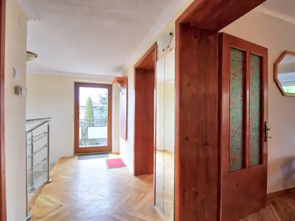 PIĘTRO: POKOJE: na podłogach parkiet, tapeta na ścianach. Pokoje wyposażone w szafy, stoliki i krzesła. ŁAZIENKA (glazura i terakota) z wanną i WC wyposażona również w umywalkę, lustro i szafki. KUCHNIA: na podłodze terakota na ścianie: glazura i gładź gipsowa. Wyposażenie: szafki kuchenne, kuchenka gazowa, piekarnik, lodówka, mikrofala. PRZEDPOKÓJ: na podłodze parkiet i płytki, na ścianach gładź gipsowa.