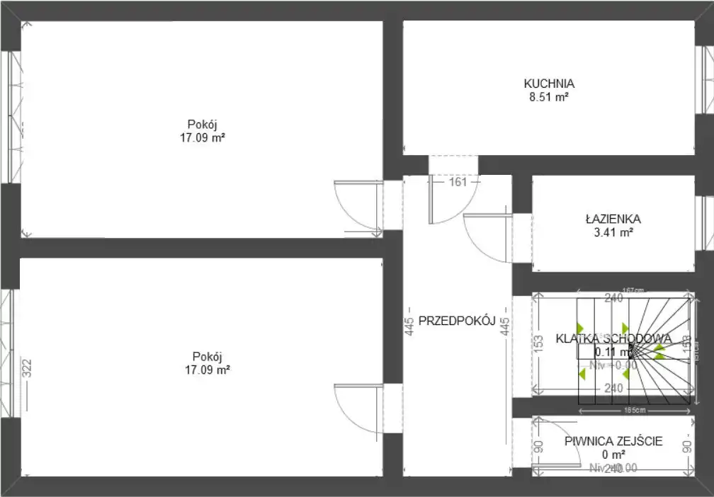 PIĘTRO w pełnym rozkładzie: 2 pokoje (po 17 m2), łazienka z kabiną prysznicową i WC (pow.: 3,5 m2), wyposażona kuchnia (pow.: 8 m2).