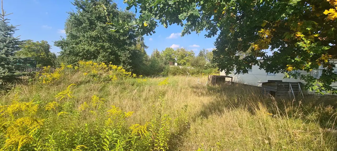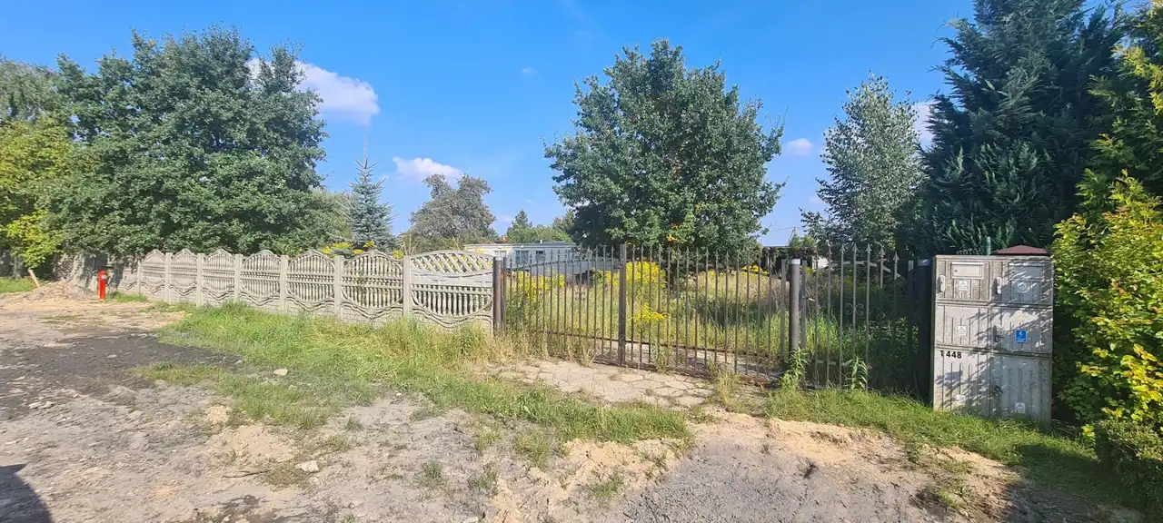 Działka ogrodzona siatką a z frontu metalową bramą z furtką oraz betonowym płotem, porośnięta trawą, wymagająca własnej aranżacji.