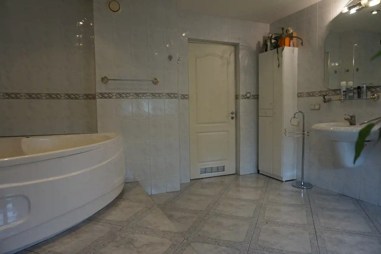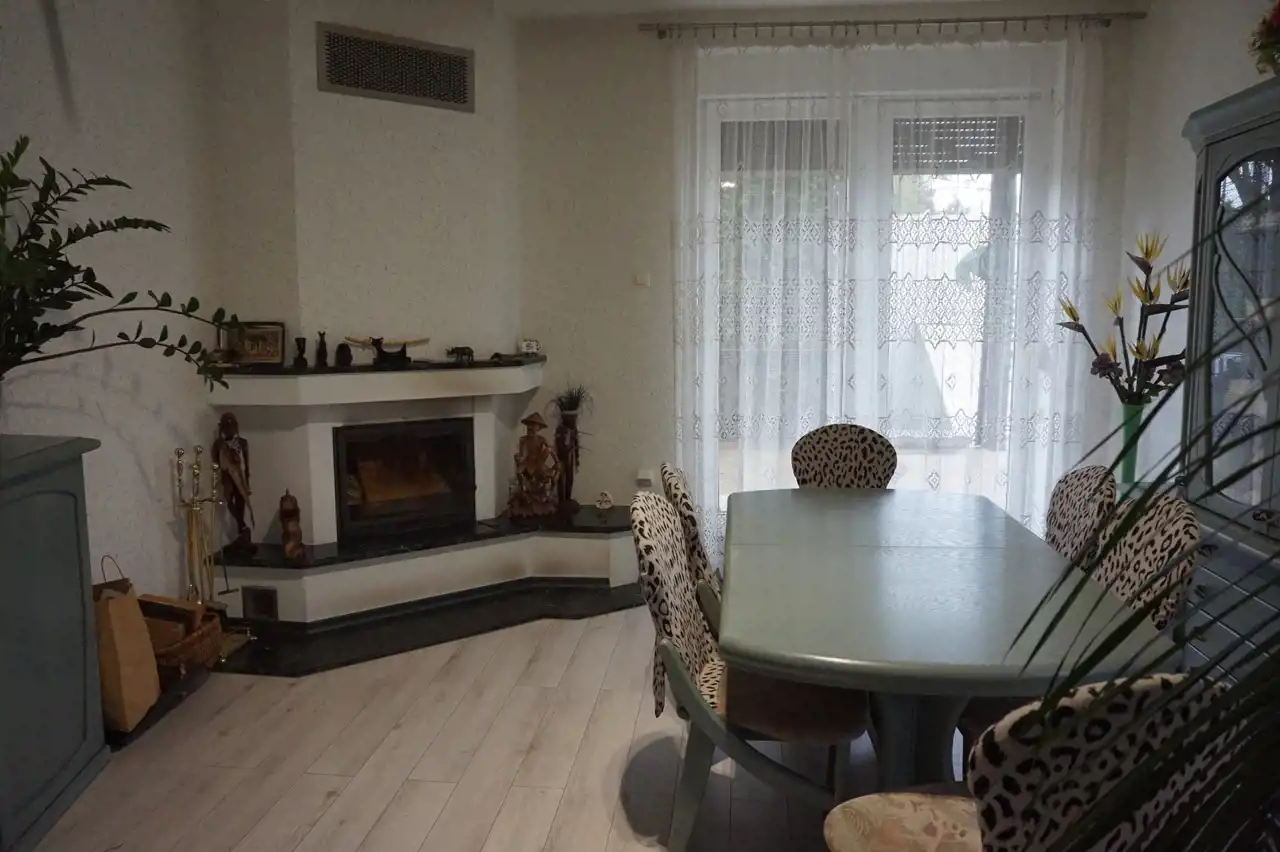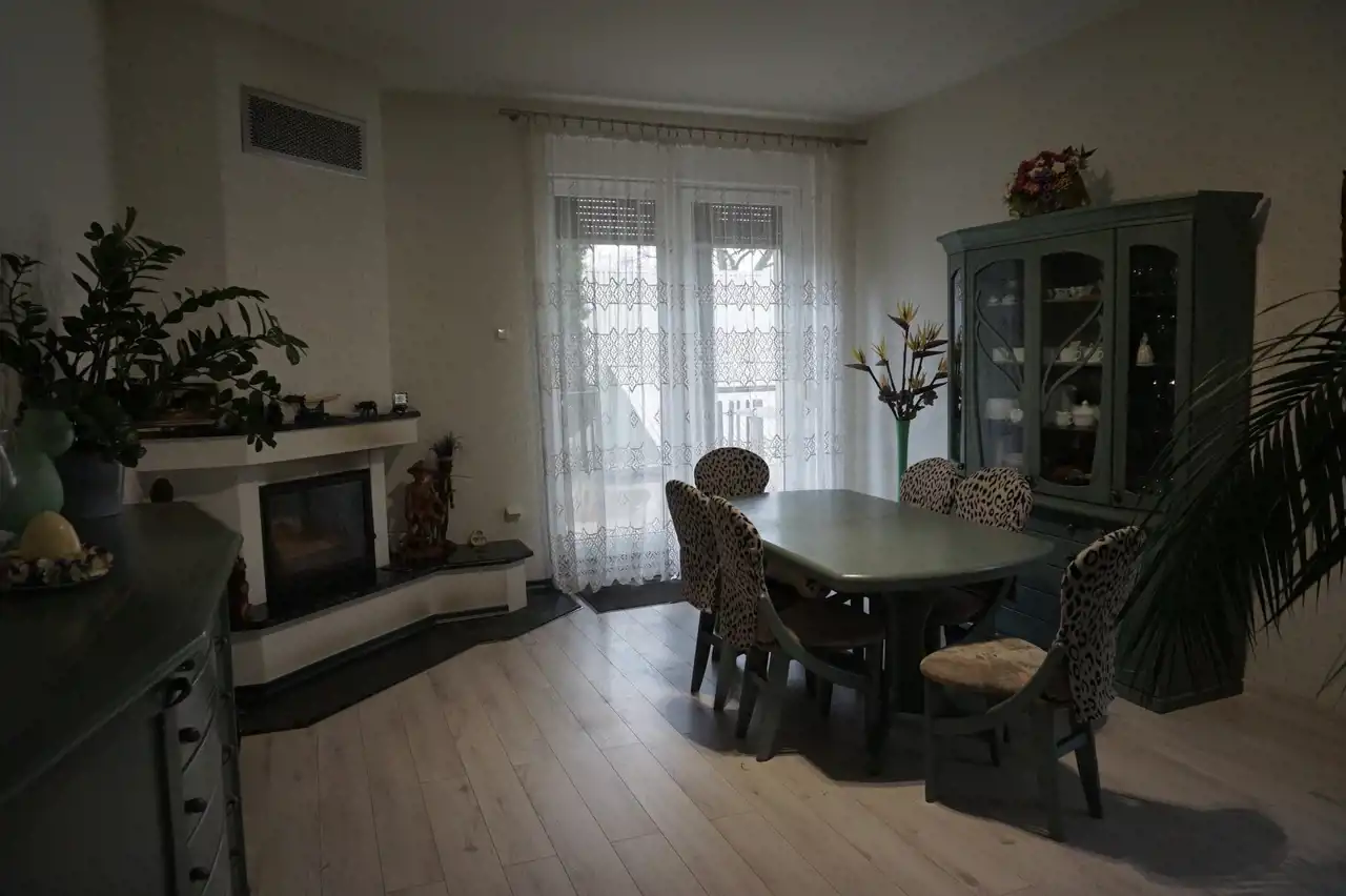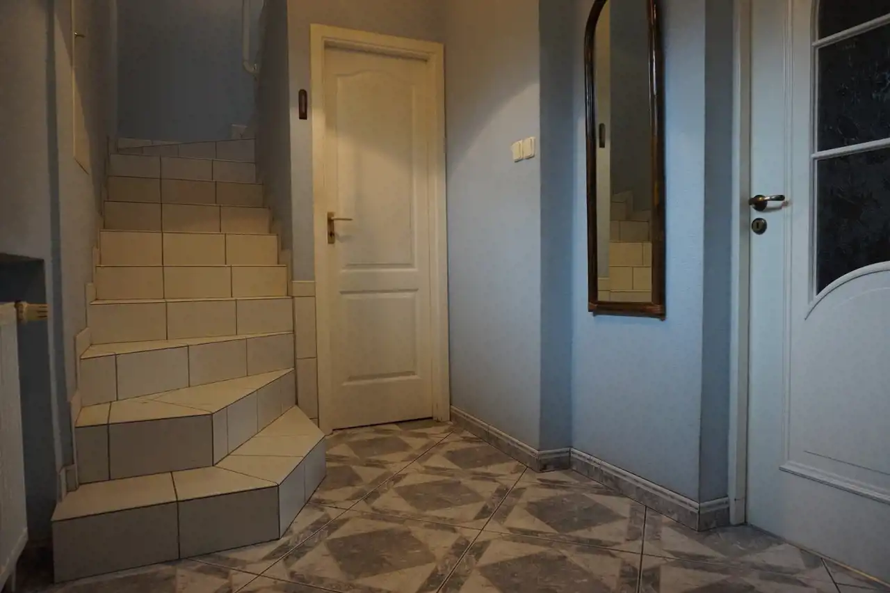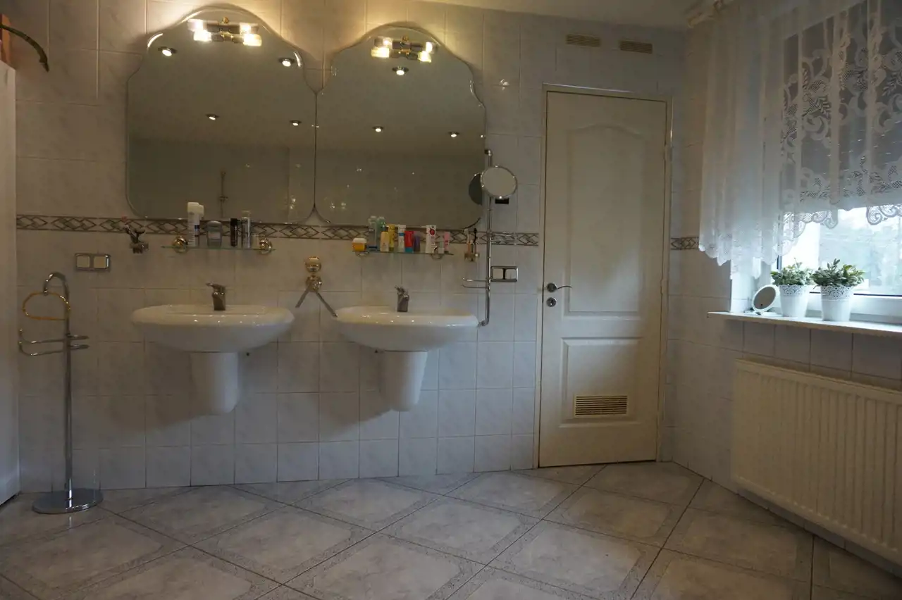 Na podłodze położone są panele oraz terakota, ściany częściowo gładź gipsowa oraz tapety. W salonie znajduje się kominek dzięki któremu możemy stworzyć przyjemny klimat. Kuchnia w glazurze i terakocie, wyposażona w meble w zabudowie oraz sprzęt agd. Łazienki wyposażone w wannę, kabinę prysznicową, wc, bidet oraz umywalki, wykończone glazurą i terakotą. Pralka i mała suszarnia usytuowana jest w osobnym pomieszczeniu przy łazience na poddaszu.