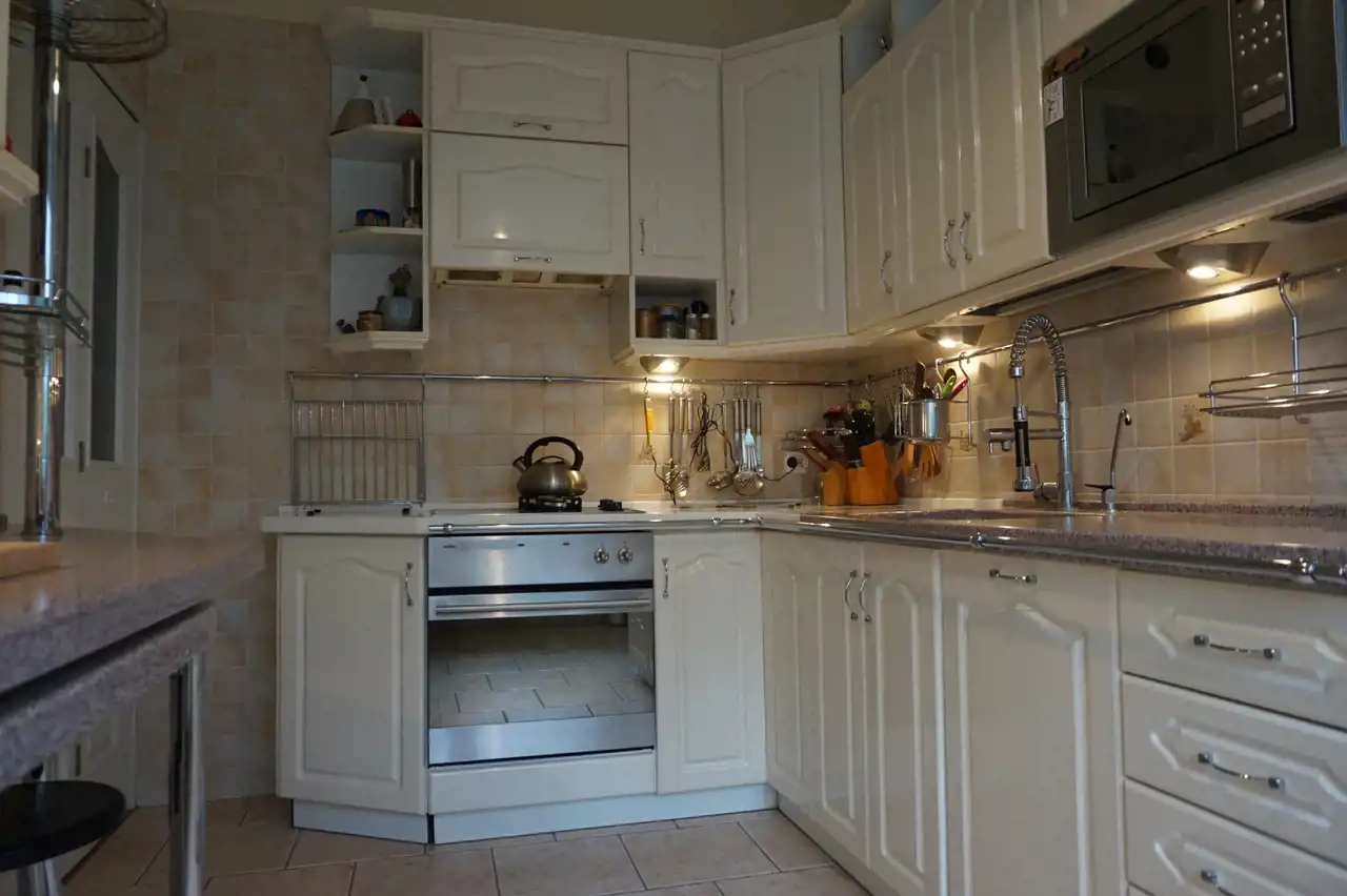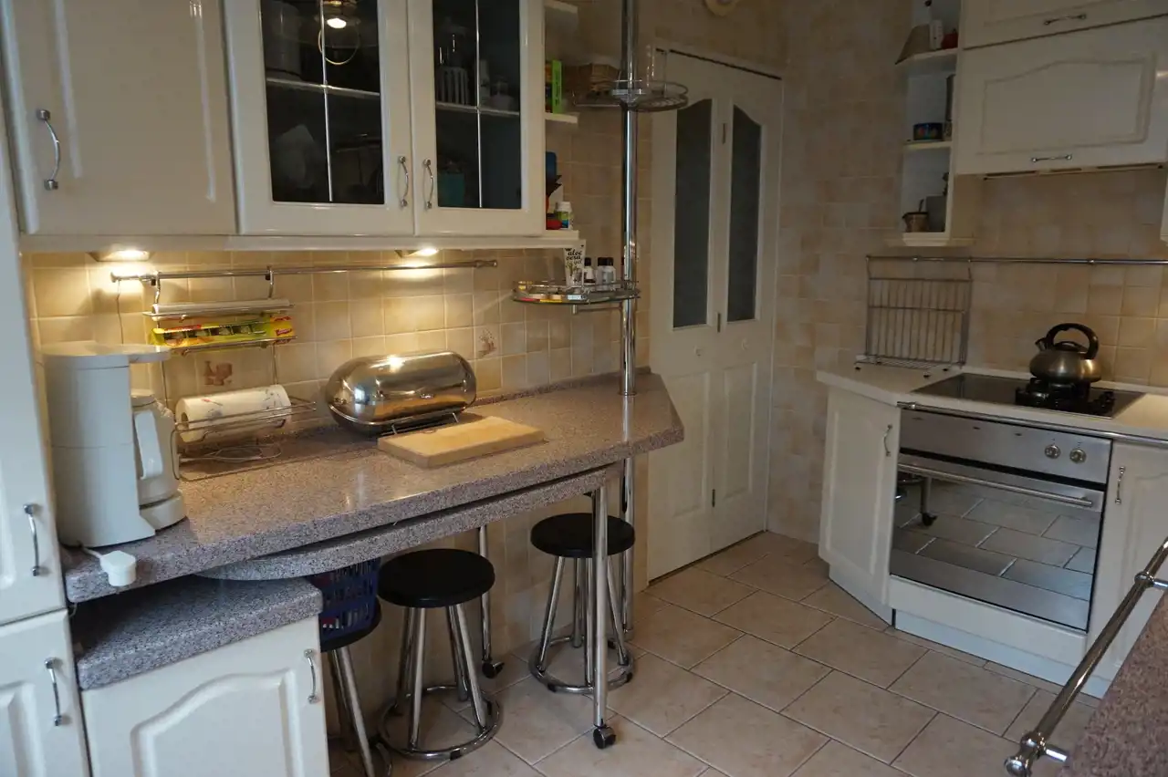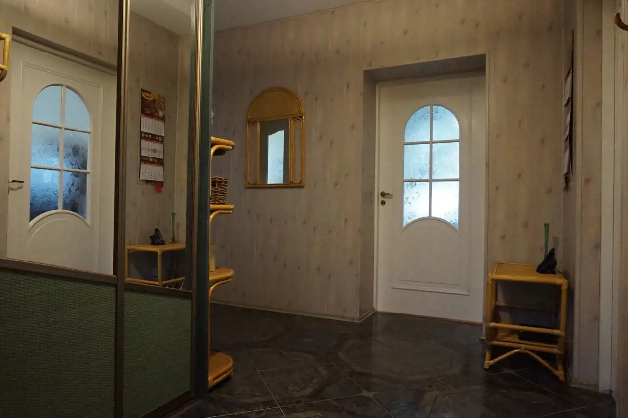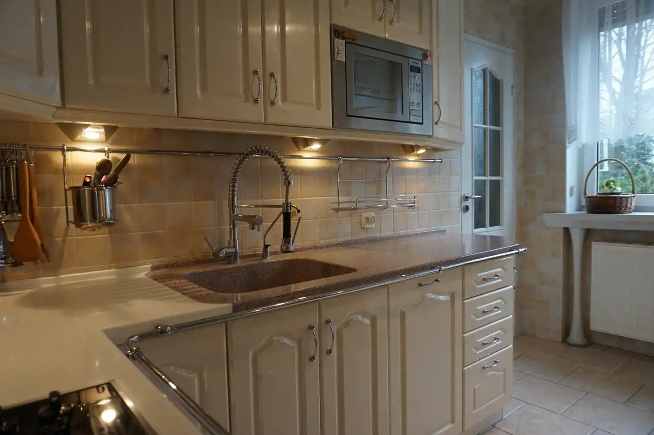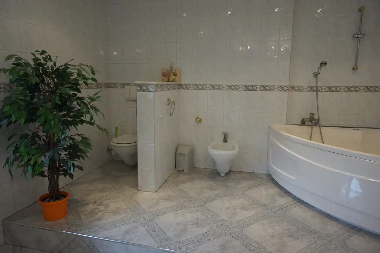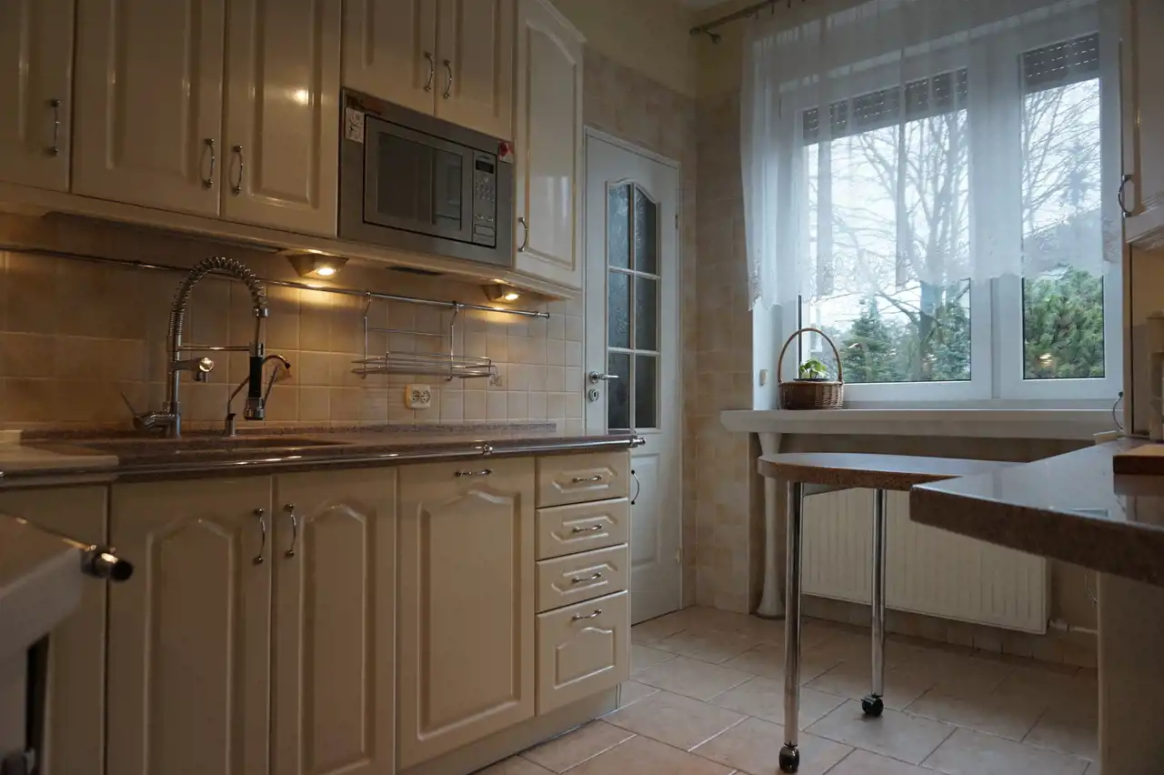 Na podłodze położone są panele oraz terakota, ściany częściowo gładź gipsowa oraz tapety. W salonie znajduje się kominek dzięki któremu możemy stworzyć przyjemny klimat. Kuchnia w glazurze i terakocie, wyposażona w meble w zabudowie oraz sprzęt agd. Łazienki wyposażone w wannę, kabinę prysznicową, wc, bidet oraz umywalki, wykończone glazurą i terakotą. Pralka i mała suszarnia usytuowana jest w osobnym pomieszczeniu przy łazience na poddaszu.