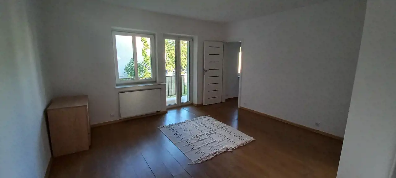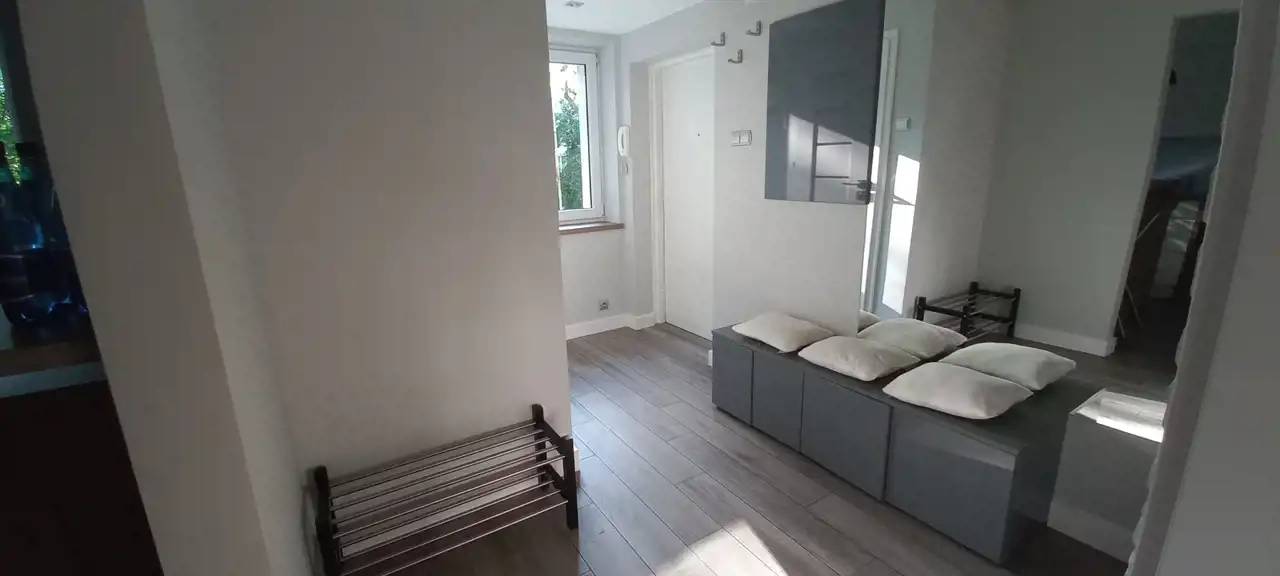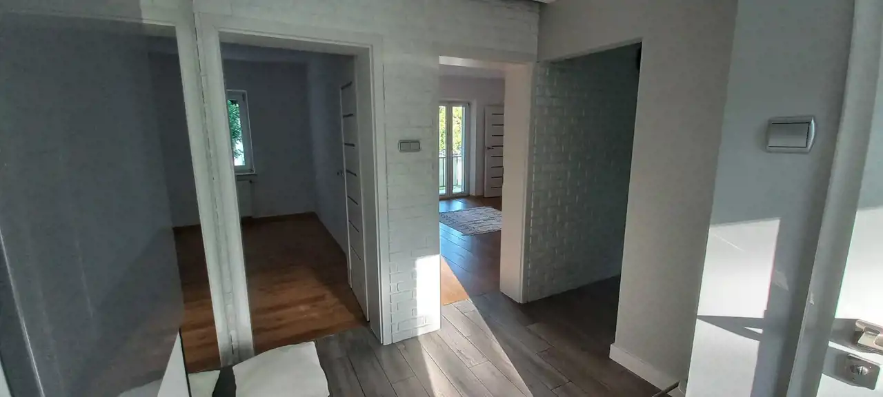 Mieszkanie składa się z umeblowanego salonu o powierzchni: 20 mkw, sypialni o pow.: 8 mkw., dwóch pokoi (17 mkw. oraz 10 mkw) widnej i wyposażonej kuchni o pow.: 7 mkw, łazienki o pow.: 3,5 mkw., przedpokoju o pow.: 8 mkw oraz WC. Do mieszkania przynależy balkon i komórka. Na ścianach w pokojach i kuchni położona jest gładź gipsowa, w łazience i WC: glazura. Na podłogach: płytki oraz panele w zależności od pomieszczenia. Łazienka wyposażona jest w wannę.