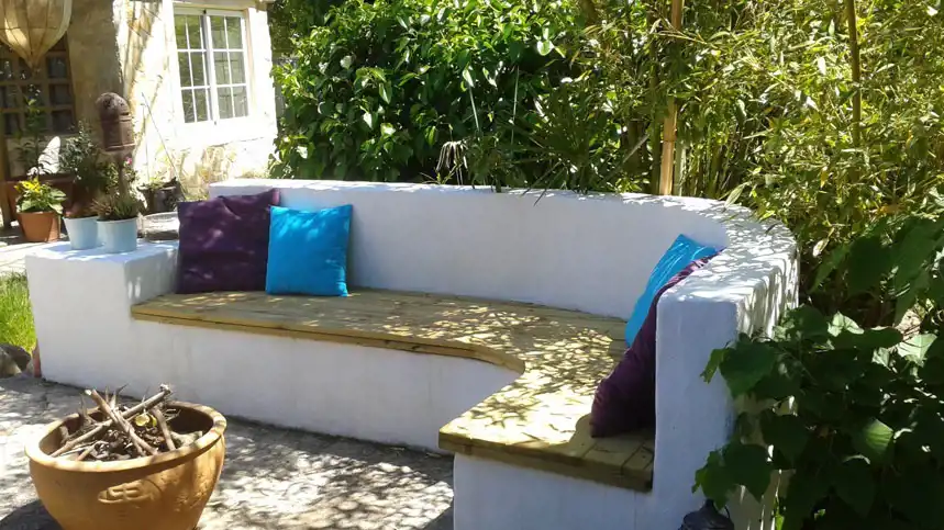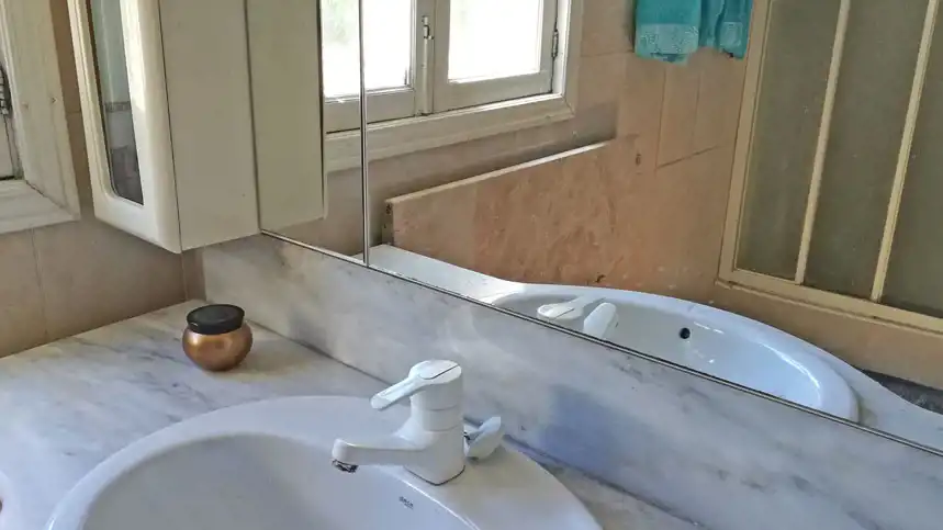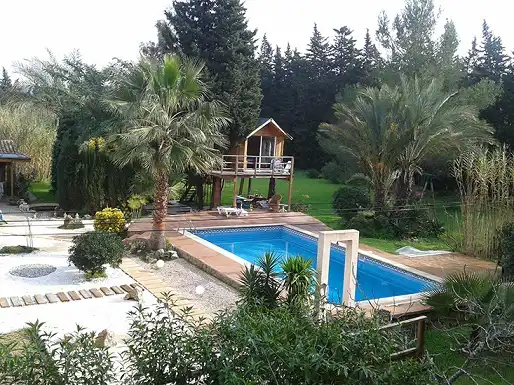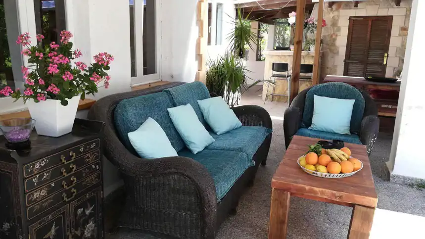 Całość otoczona niskim kamiennym murem oraz szpalerem wysokich cyprysów zapewniających pełną prywatność. Podjazd do parkowania kilku aut.