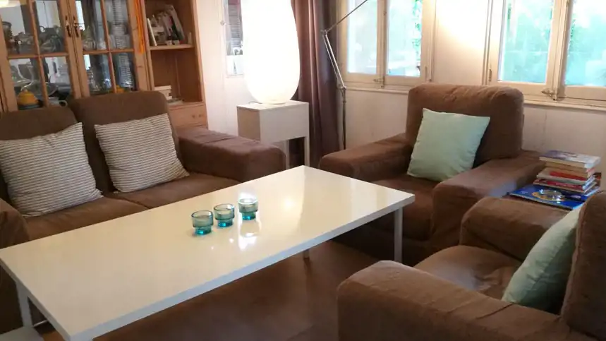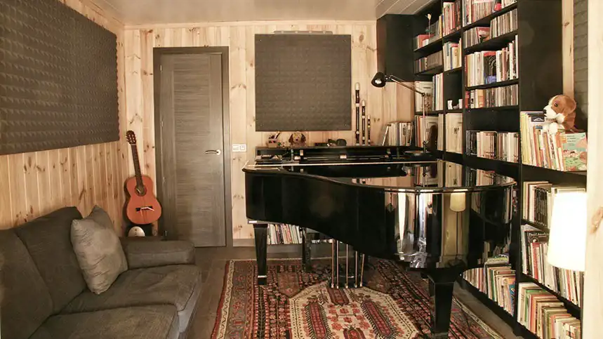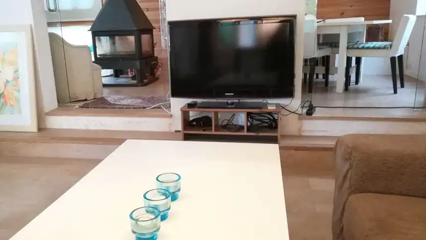 -Parter: 2 sypialnie, jedna z bezpośrednim dostępem do łazienki, toaleta, jadalnia wyposażona w klimatyzację, z wyjściem na taras i ogród, świeżo wyremontowana i wyposażona kuchnia (zmywarka i klimatyzacja), salon z klimatyzacją i kominkiem, wyciszone studio nagraniowe, pomieszczenie gospodarcze z pralką, suszarką i zlewem. Garaż na 2 samochody.