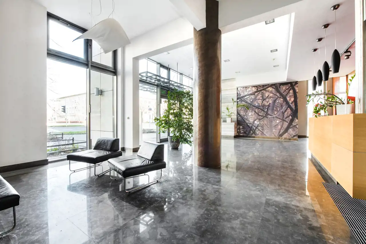 Na wejściu do budynku znajduje się recepcja, która usprawnia załatwianie bieżących spraw mieszkańcom, a dodatkowo własny, całodobowy system alarmowy zapewnia pełne bezpieczeństwo.