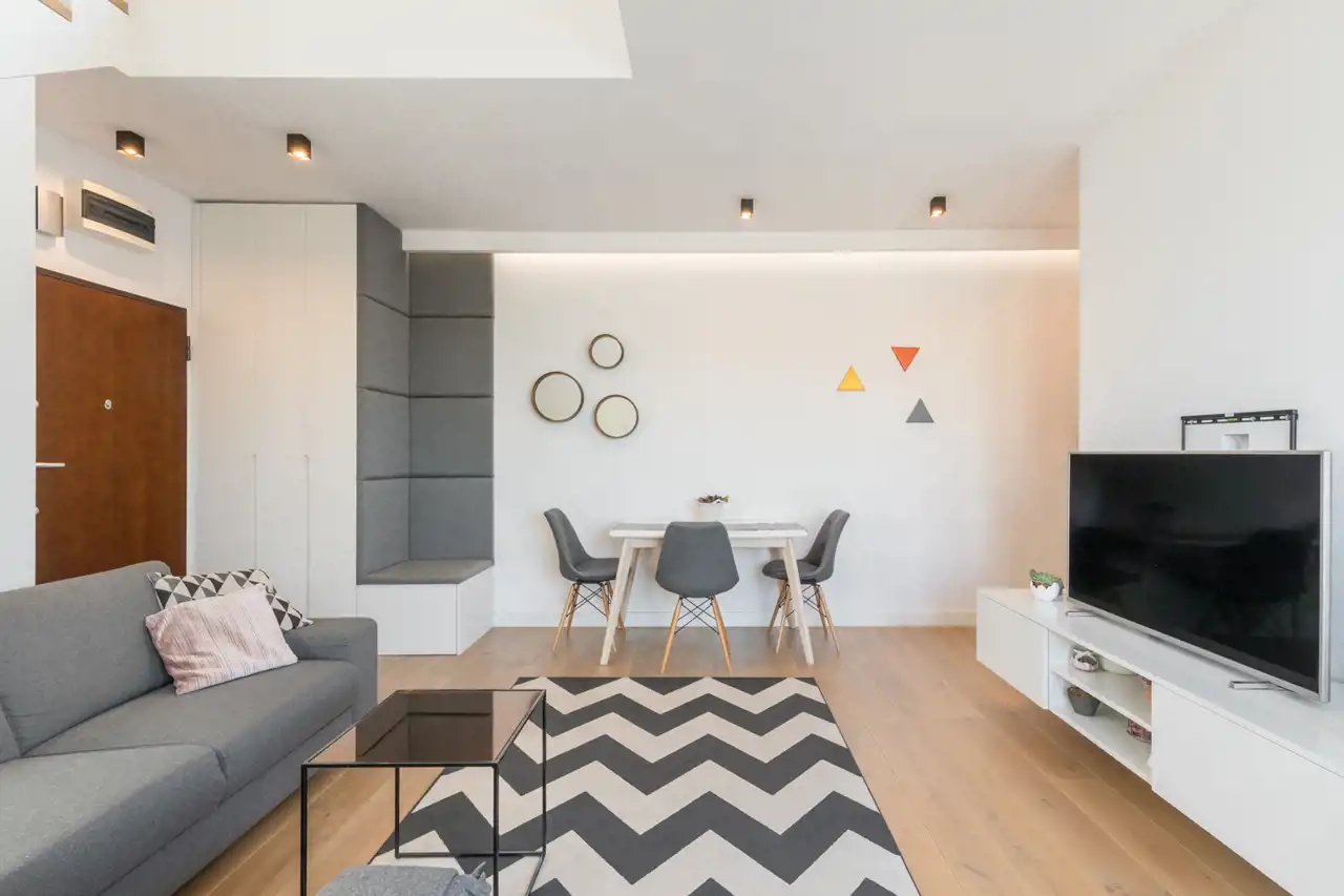 - wysoki standard wykończenia, apartament jest w idealnym stanie (drewniany parkiet – dąb jasny, zabudowa drewniana na wymiar, włoskie kafle na wymiar w kuchni i łazience);