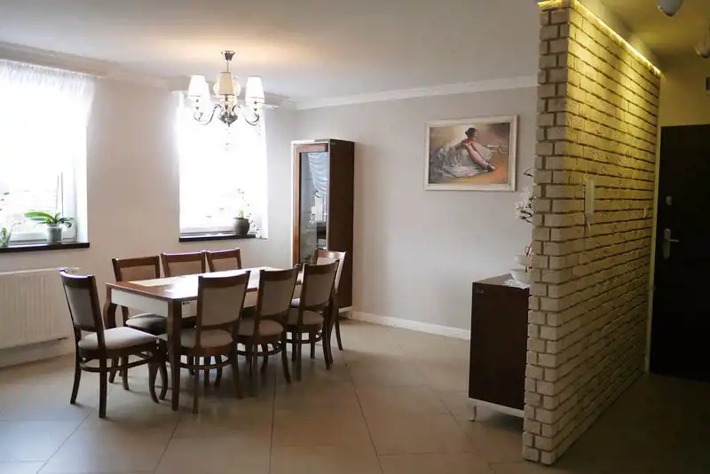 Luksusowa oferta apartamentu dwupoziomowego 4-pokojowego o powierzchni 95,80 m2 położonego na III-cim piętrze w budynku z nowej cegły na terenie ogrodzonym w Centrum miasta. Eksponowana GALERIA ZDJĘĆ z trwałym wyposażeniem wliczona w cenę apartamentu, pozostałe wyposażenie do uzgodnienia!!! Na uwagę zasługuje nowatorski, klasyczny styl wykończenia lokalu z zastosowaniem najnowszych trendów w aranżacji wnętrza. Pierwszy poziom lokalu obejmuje otwartą część dzienną, w tym przedpokój, jadalnię z otwartym aneksem kuchennym, salon i toaletę. Aneks kuchenny wyposażony jest w stylową, komfortową zabudowę na wymiar oraz wysokiej jakości urządzenia AGD (zmywarka, płyta indukcyjna, pochłaniacz, kuchnia mikrofalowa) renomowanej firmy: Ariston. Wyrazista kolorystyka deseni wenge/orzech z ciepłymi pastelami podłóg wykonanych z gresu włoskiego oraz ciemnych paneli w salonie nadają niepowtarzalny urok wnętrz. W przedpokoju została zaprojektowana zabudowa KOMANDOR, która w istotny sposób zapewnia komfort w codziennym użytkowaniu (do uzgodnienia za dodatkową opłatą). Przepiękna łazienka z nową armaturą wraz z doskonale wypracowanymi szczegółami zapewni komfort i przyjemny relaks podczas kąpieli. Na drugi poziom prowadzą efektowne drewniane schody w kolorze bieli i wenge. Sypialnia zaaranżowana w nowoczesnym, harmonijnym stylu połączona z odrębną garderobą oraz przestronny pokój dziecięcy z umeblowaniem wbudowanym na wymiar. Niskie koszty eksploatacji to podstawowy atut lokalu (czynsz regulowany), stacja uzdatniania wody na wyposażeniu budynku. Wspólnota prężna i rozwojowa. Możliwość wynajęcia miejsca parkingowego pod budynkiem za niedużą opłatą. Idealna inwestycja dla osób poszukujących gotowego mieszkania do zamieszkania.
