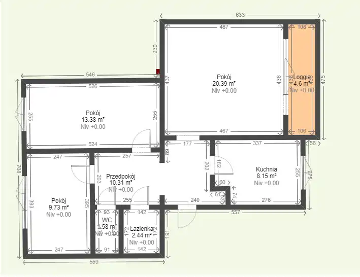 - 3 pokoi o powierzchniach (ok. 20,4: 13,4: 9,7m²)
