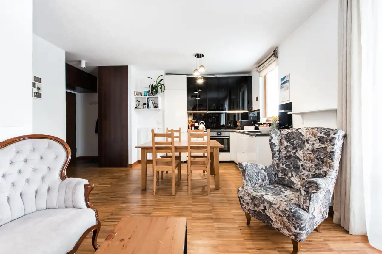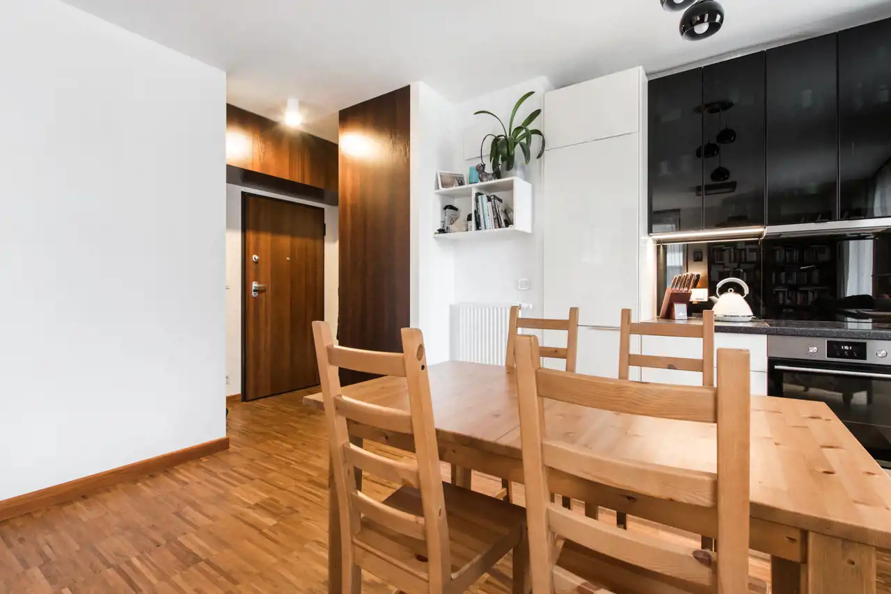 - Otwarta kuchnia, w pełni wyposażona (piekarnik, lodówko-zamrażarka, płyta indukcyjna): 6.5 m2