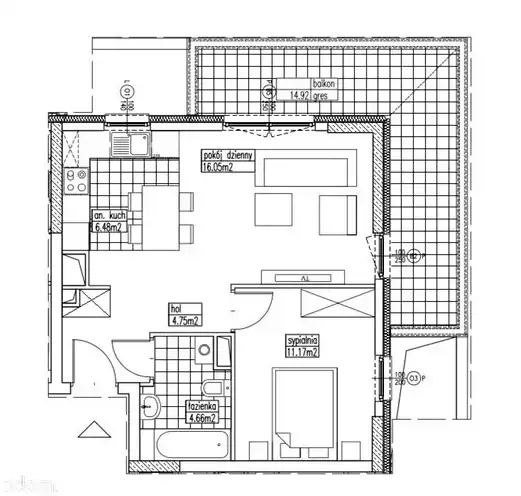- Słoneczny i przestronny salon z wyjściem na balkon: 16 m2