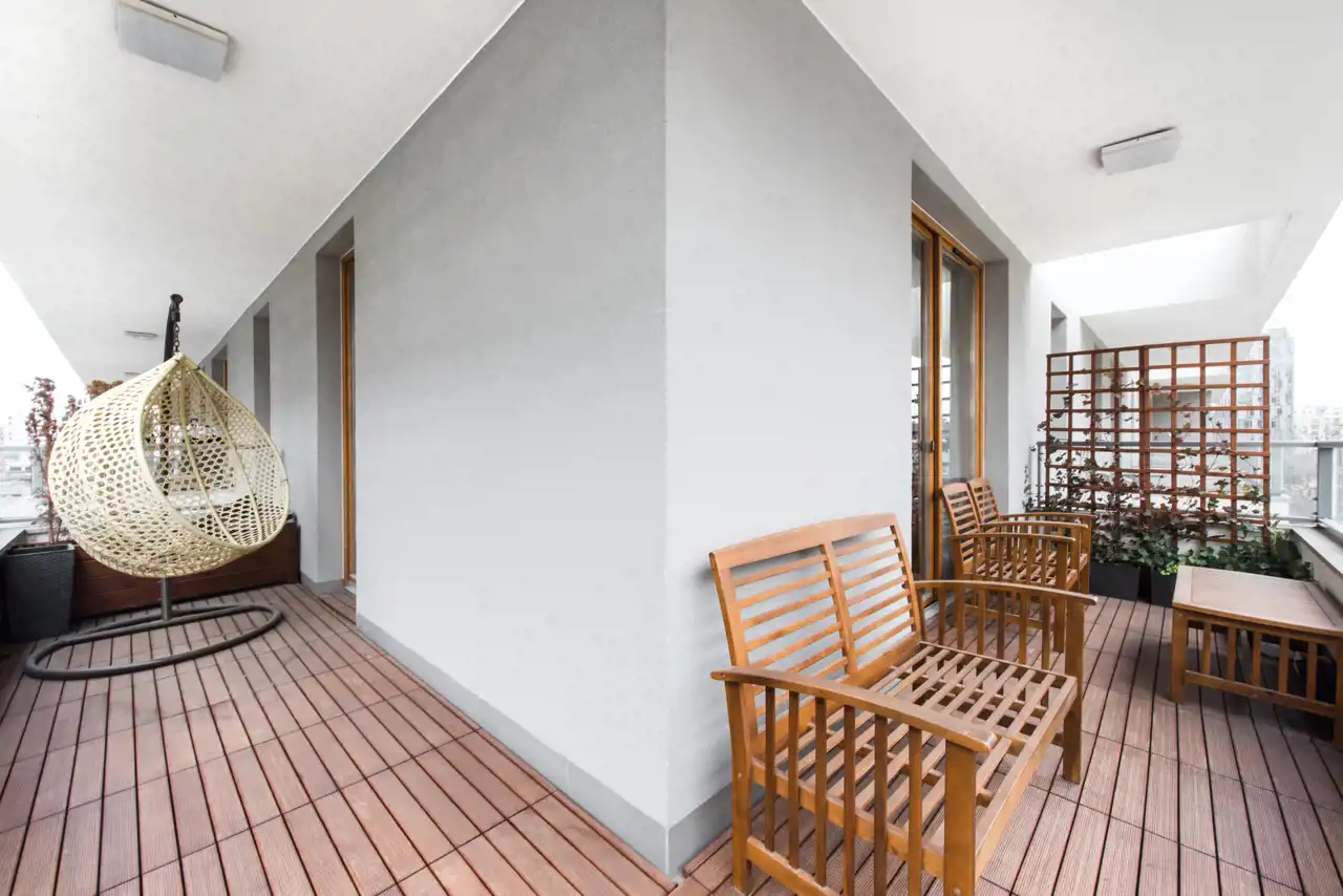 Szczególnym atutem mieszkania jest piękny, narożny taras, który ma powierzchnię prawie 15 m2.