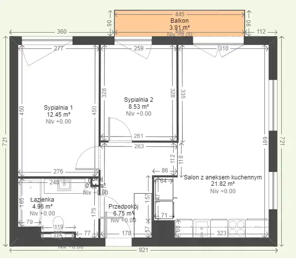 - salon z aneksem kuchennym (21,8 m2)