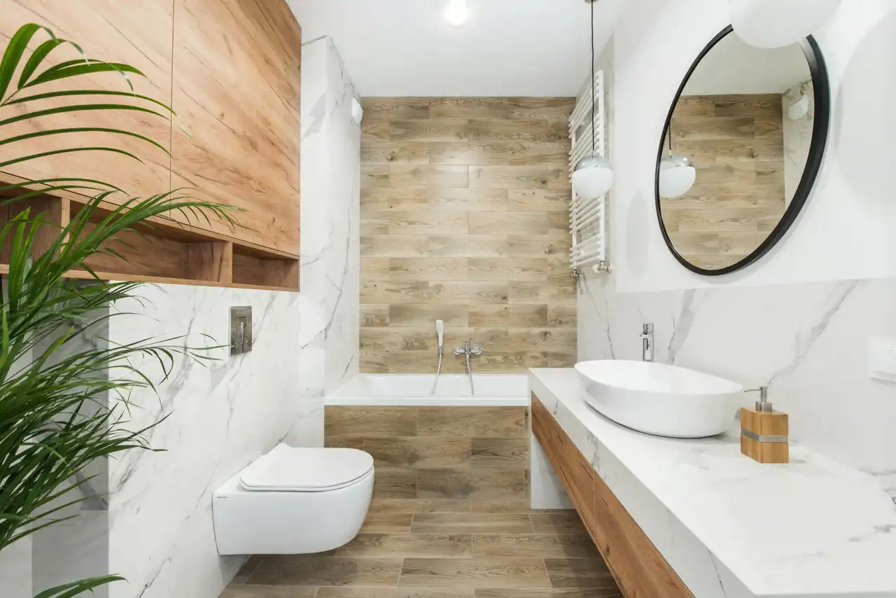 - łazienka (5 m2) – w pełni urządzona, gres i terakota, wanna, toaleta z zestawem podtynkowym, wisząca szafka ze zlewem, nad którym zostało zainstalowane klimatyczne lustro