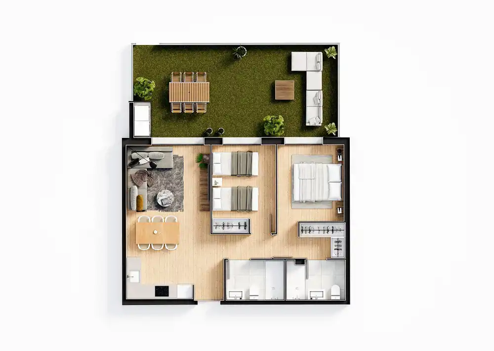 Domy w obiekcie Essential dysponują 2 łazienkami, kuchnią na otwartym planie oraz salonem/jadalnią . Przestronne tarasy wtapiają się w salon dzięki dużym oknom. Do każdego mieszkania przynależy miejsce parkingowe w garażu podziemnym.
