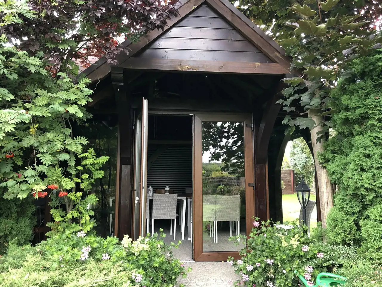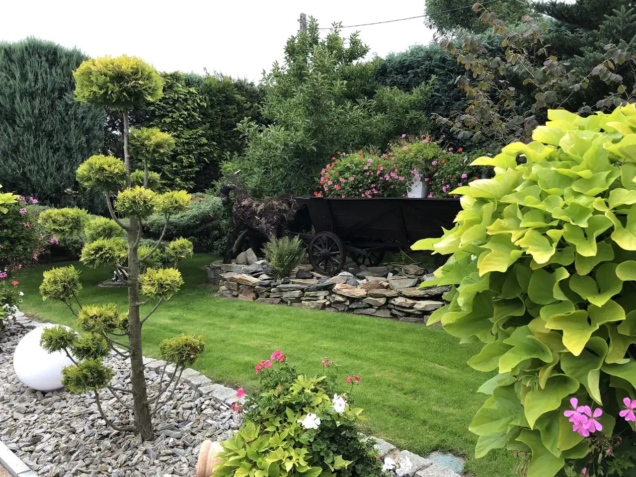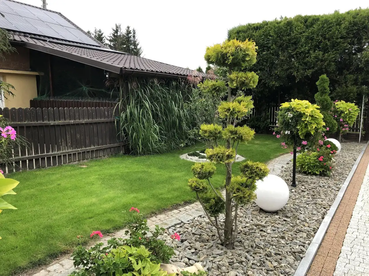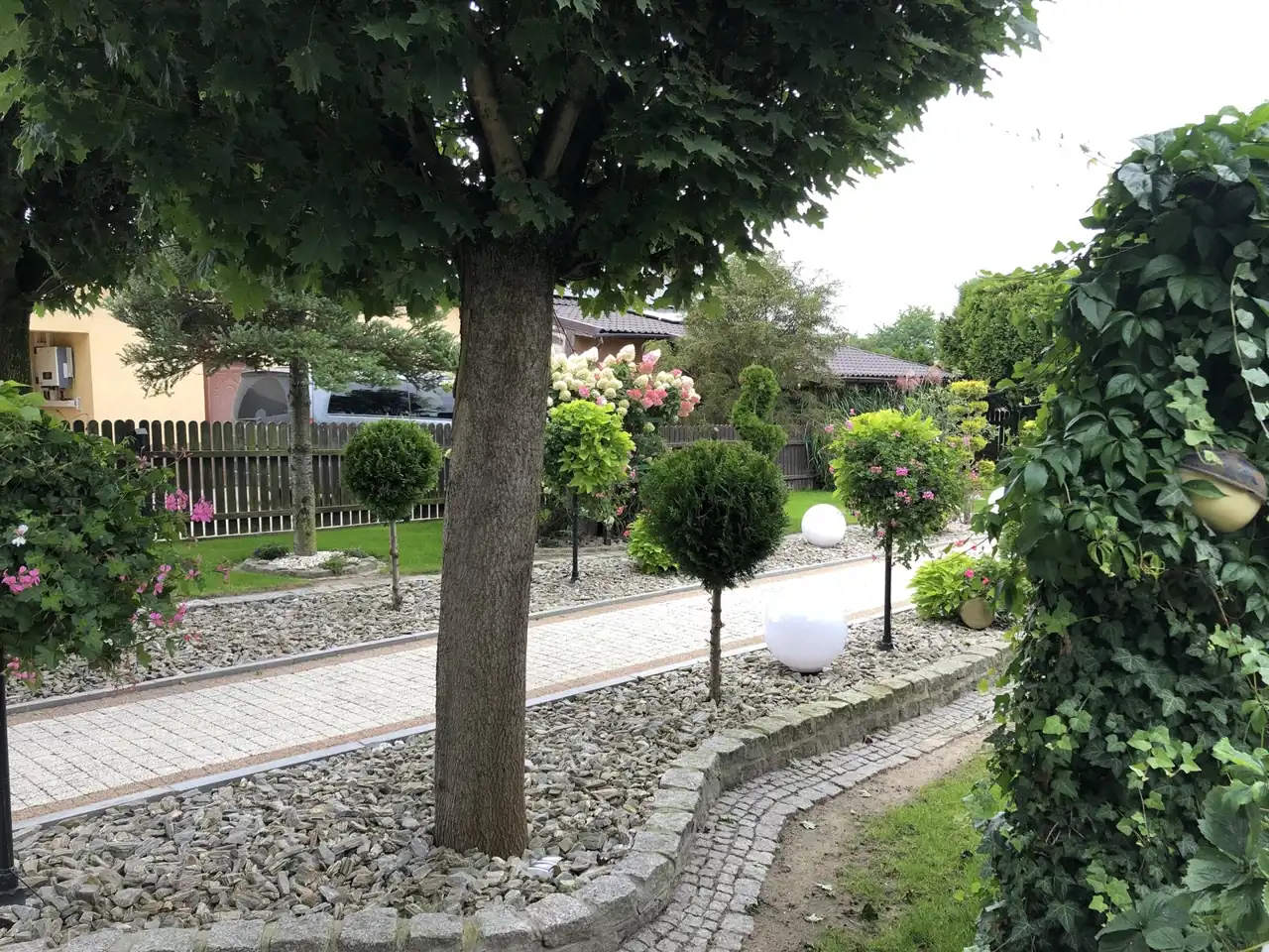 Ogród pięknie zagospodarowany z licznymi nasadzeniami, dodatkową zabudowaną kuchnią letnią i miejscem na grilla, paleniskiem. W całym ogrodzie rozprowadzone nawadnianie, woda ze studni.