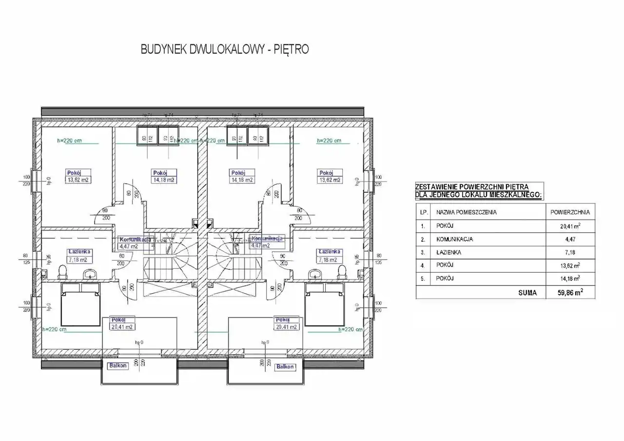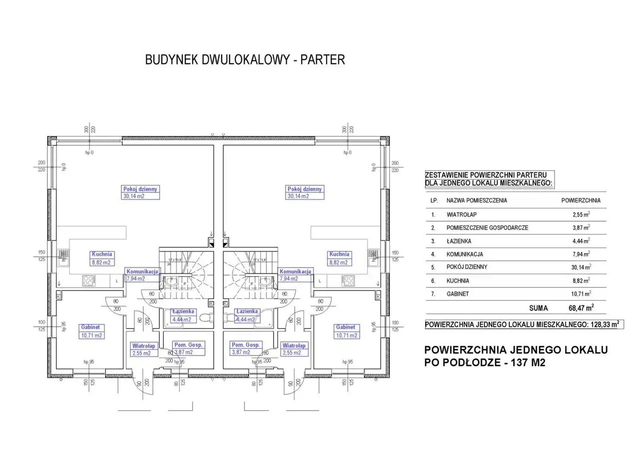 Jeden lokal w budynku dwulokalowym, składa się z parteru i poddasza, posiada oddzielne wejście z zewnątrz. Powierzchnia użytkowa pojedynczego lokalu wynosi 128,33 m2( po podłodze 135 m2 + pow. balkonu). Każdy lokal będzie posiadał, przeznaczoną do wyłącznego użytku właściciela lokalu, ogródek o powierzchni ok 180 m.kw , składający się z terenu zielonego, podjazdu, ścieżki, parkingu.