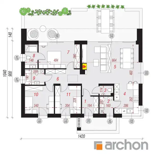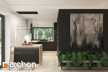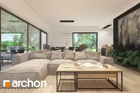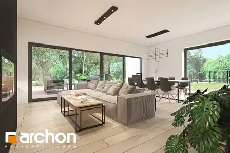 Dom parterowy składa się z salonu o powierzchni 30,02 m.kw, otwartej kuchni o pow. 9,87 m.kw, dwóch łazienek o pow. 3,97 m.kw+ 3,95 m.kw, wc o pow. 1,64 m.kw, trzech pokoi o pow. 13,25 m.kw.+ 10,89 m.kw.+ 9,72 m.kw, wiatrołapu o pow. 3,76 m.kw, korytarza o pow. 9,42 m.kw oraz kotłowni o pow.3,09 m.kw.