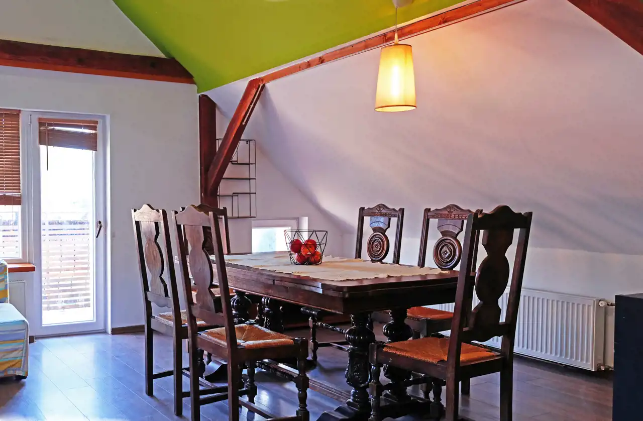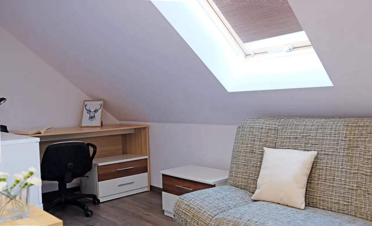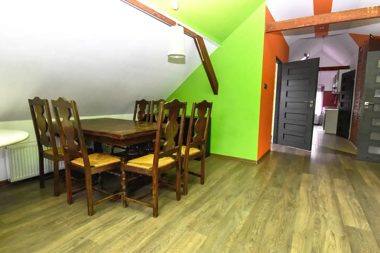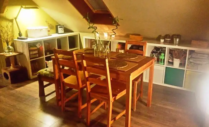 W skład poddasza( powierzchnia ok. 60m.kw) wchodzi : 2 pokoje, kuchnia, spiżarnia, salon, łazienka, balkon