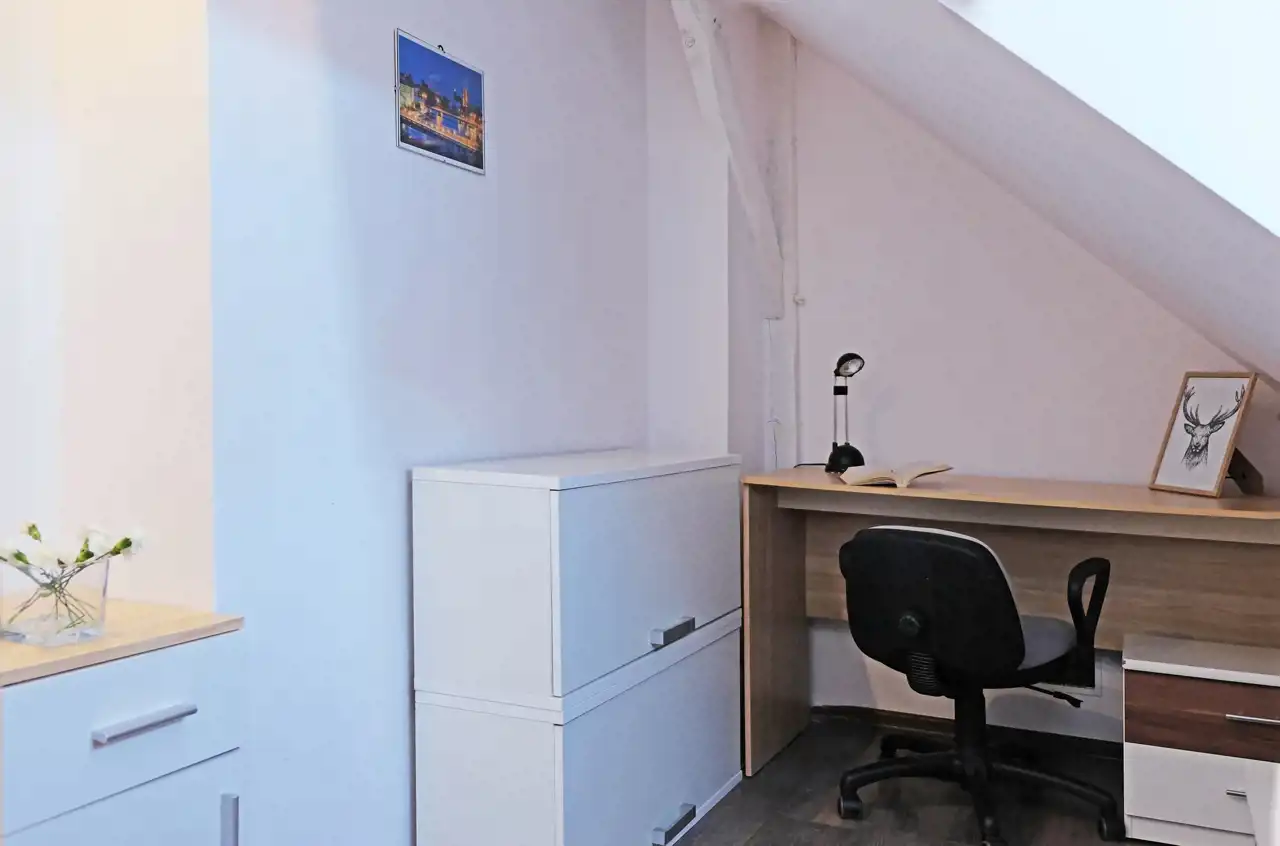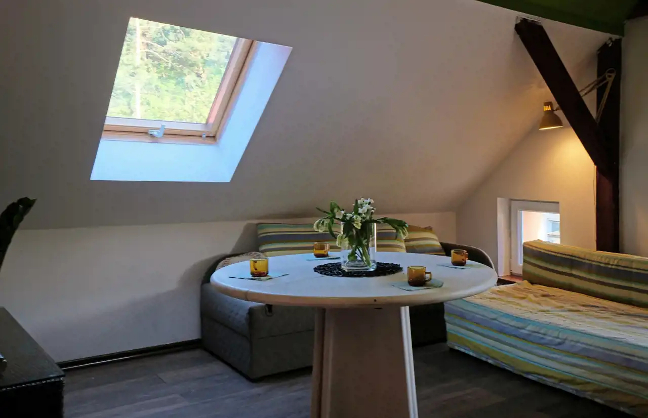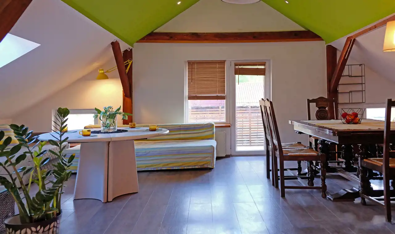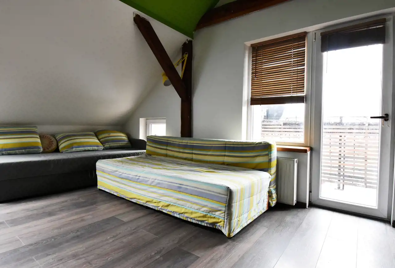 W skład poddasza( powierzchnia ok. 60m.kw) wchodzi : 2 pokoje, kuchnia, spiżarnia, salon, łazienka, balkon