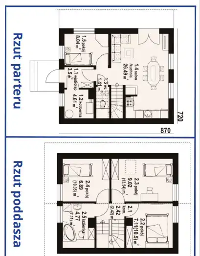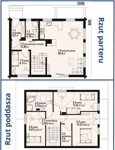 Piętro: (podane powierzchni użytkowe, całkowite odpowiednio większe) pokoje 13/14/10m2, łazienka 5,75m2, korytarz 4m2, balkon.