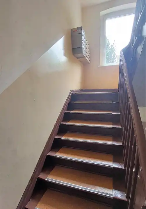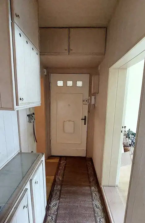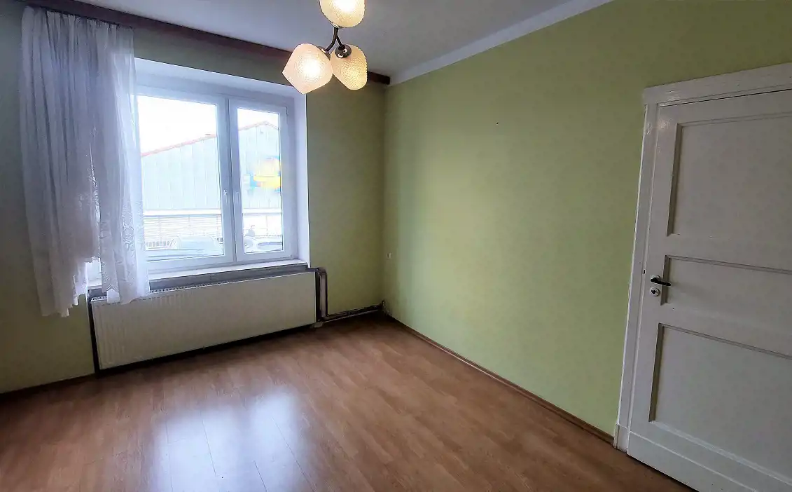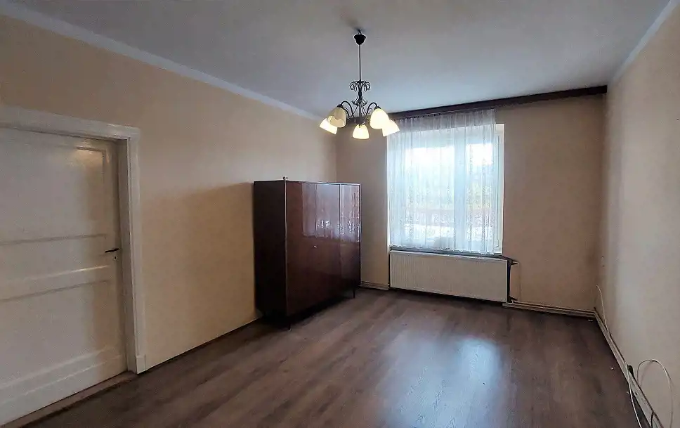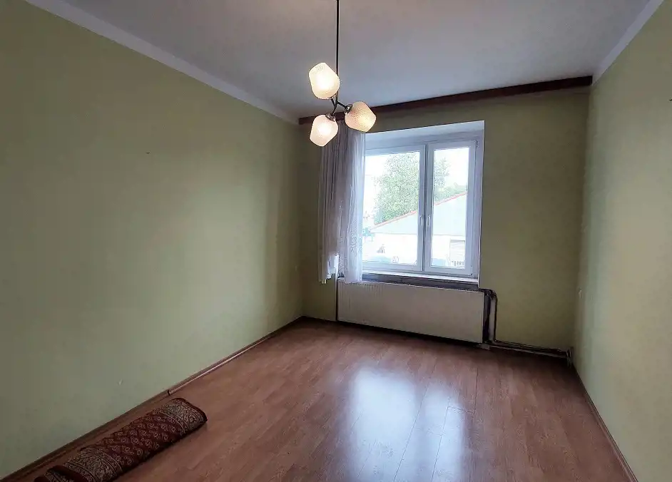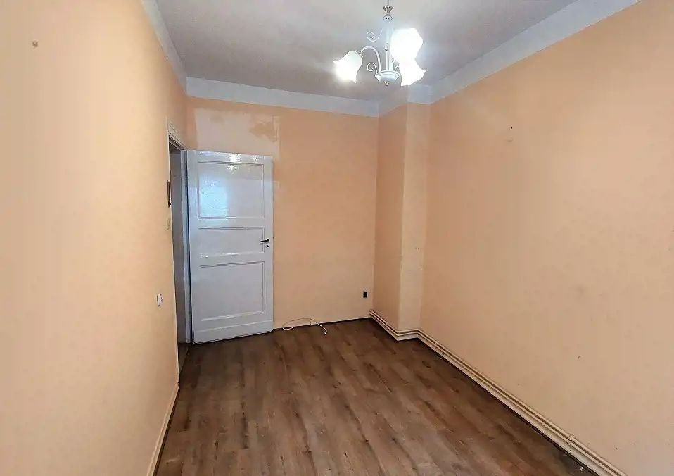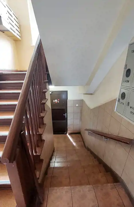 Lokal jest w stanie do remontu lub głębszego odświeżenia i składa się z: pokoi 18/16/12m2, oddzielnej kuchni 7m2, łazienki z WC 3m2, holu 6m2 i przynależnej piwnicy. Łazienka jest przedzielona niską ścianką na część do mycia (wejście od kuchni) i część toalety (wejście z korytarza).