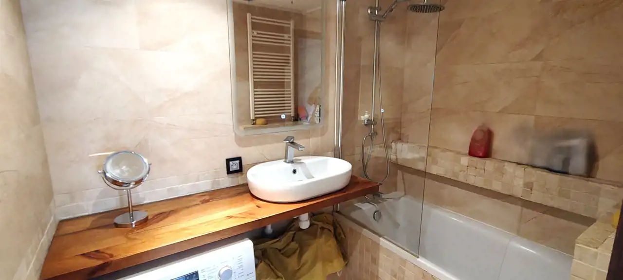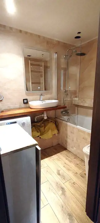 Łazienka i WC wykończone glazurą i terakotą, łazienka wyposażona w wannę. Kuchnia wykończona terakotą , na ścianach częściowo terakota, częściowo gładkie, malowane. W pokojach podłogi wykończone deską barlinecką, ściany gładkie, malowane. Okna w mieszkaniu wszystkie PCV.