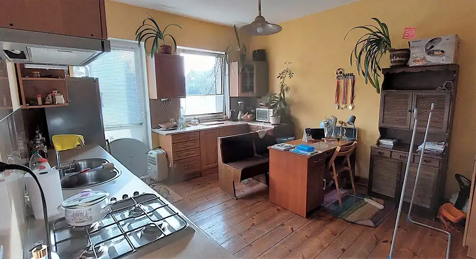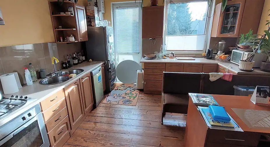 Ściany gładzone i malowane, w łazience w glazurze. Łazienka z wanną, sedesem, umywalką. Podłogi w łazience z terakoty, w pozostałych pomieszczeniach deska podłogowa oryginalna, cyklinowana i lakierowana. Okna PCV (w jednym pokoju jeszcze stare drewniane) z wystawą na południe i północ, z widokami na spokojną ulicę lub ogród. W kuchni okno balkonowe kiedyś przygotowane do zejście bezpośredniego do ogrodu. Instalacje wodno-kanalizacyjne, elektryczne i gazowe sprawne. Przynależna piwnica to 3 pomieszczenia, w jednym jest piec gazowy dwuobiegowy do ogrzewania całego mieszkania. Mieszkanie bezczynszowe (nie ma zarządcy zewnętrznego, nie jest zbierana opłata na FR, remonty są robione na bieżąco w uzgodnieniu z sąsiadami). Koszty zużycia mediów i wywóz śmieci rozliczany indywidualnie.