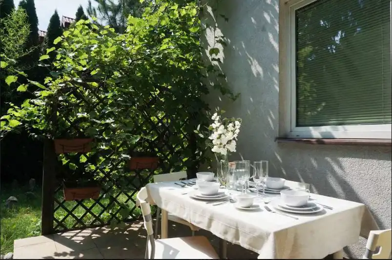 Dom z dużym tarasem znajduje się na działce z ogrodem o powierzchni 512 m2