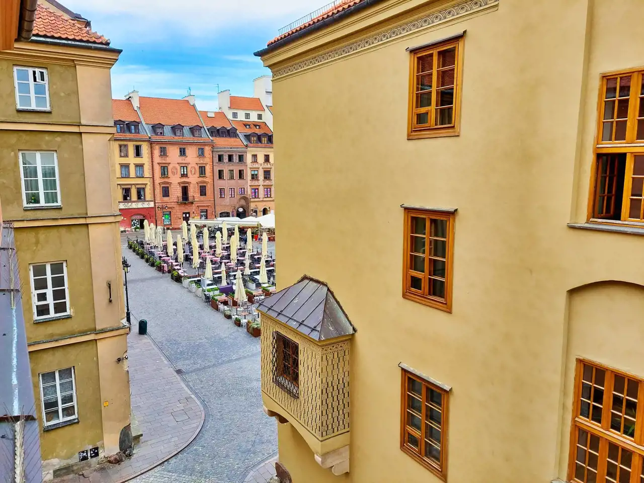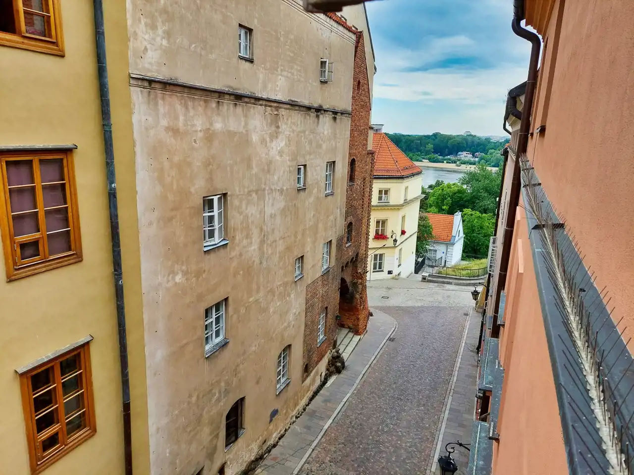 Okna wychodzą na stronę zachodnią. Widać z nich Rynek Starego Miasta oraz Wisłę.