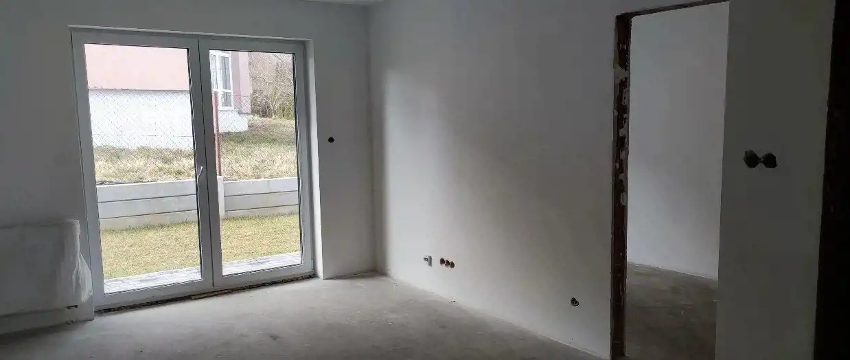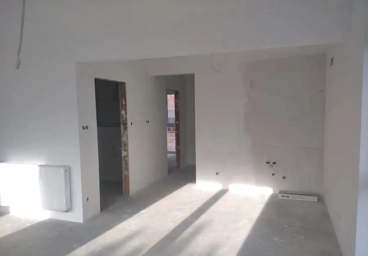 Mieszkanie w stanie deweloperskim podwyższonym, ściany mają zrobione gładzie i są pomalowane na biało.