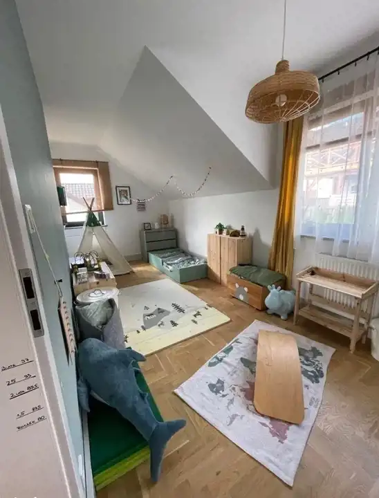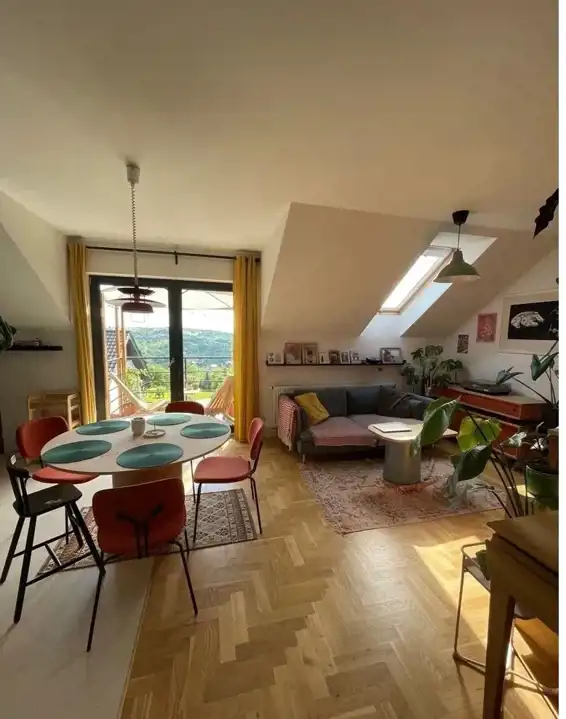 Klatka schodowa (6) schody wykonane zostały z mikrocementu marki Festfloor. Balustrada wykonana ze sklejki brzozowej.Na piętrze we wszystkich sypialniach i salonie podłoga parkiet - lity dąb. Łazienka (5): podłoga podgrzewana (ogrzewanie elektryczne ze zdalnym sterowaniem),płytki podłogowe villeroy&boch, brodzik wykonany z konglomeratu, zabudowa prysznicowa marki Radaway W łazience wykonano zabudowy meblowe w których mieści się:pralka wraz suszarka marki Amica, piec dwufunkcyjny Deditrich, mobilne kosze na pranie, regały na kosmetyki i akcesoria łazienkowe.Garderoba (2): podłoga - wykładzina, zabudowa meblowa 4 duże szafy PAX Sypialnia: do sypialni przynależy garderoba (2) oraz balkon (podłoga drewniana).Salon wraz z aneksem kuchennym - ekspozycja południową z widokiem na okolice i góry. Do salonu przynależy balkon (podłoga drewniana) i z wykonaną pergolą, która umila spędzany tam czas. Meble w salonie wykonane na zamowienie według indywidualnego projektu - materiał zabudowy Fornir dębowy. W części kuchennej płytki , zabudowa meblowa w kuchni wykonana na wysokiej jakości okuciach marki BLUM, korpusy mebli wykonane z płyty egger fronty ze sklejki brzozowej, blat drewniany w zabudowie zmywarka piekarnik i płyta indukcyjna, okap, zlew ceramiczny.