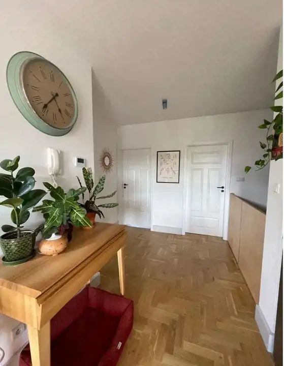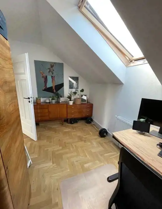 Opis mieszkania: ( zgodny z załączonym planem):1 pokój 12,74m22 garderoba 3,3m23 sypialnia 10,694 salon z aneksem kuchennym 25,915 łazienka 6,956 korytarz 5,49m27 gabinet 7.9m2Wejście do mieszkania przez wiatrołap, jest to część wspólna z mieszkaniem znajdującym się na parterze.Drzwi wejściowe zostały wymienione na drzwi drewniane ( wykonane z drzewa merantii), drzwi wykonane w podwyższonej ochronie antywłamaniowej.Parter komunikacja na podłodze wysokiej jakości płytki podłogowe Terrazzo 80x80.Pod schodami znajduje się spory schowek na narzędzie lub rowery .