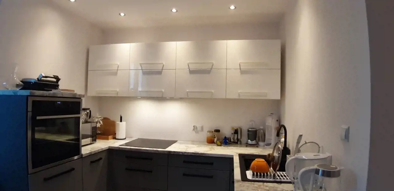 Na podłogach położone są parkiet oraz gres. Ściany pomalowane. Kuchnia w zabudowie wraz ze sprzętem agd (płyta indukcyjna, pochłaniacz, zmywarka, piekarnik elektryczny, lodówka, zamrażarka, mikrofalówka). Wyposażenie widoczne na zdjęciach do uzgodnienia. Instalacje elektryczna, wodno-kanalizacyjna i gazowa wymienione na nowe. Ogrzewanie gazowe-piec dwufunkcyjny.