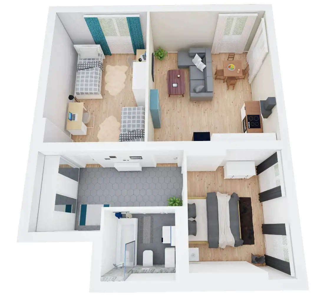 Mieszkanie zaprojektowane w układzie 3 pokoi z aneksem kuchennym, co zapewnia niezwykłą funkcjonalność każdego z pomieszczeń.